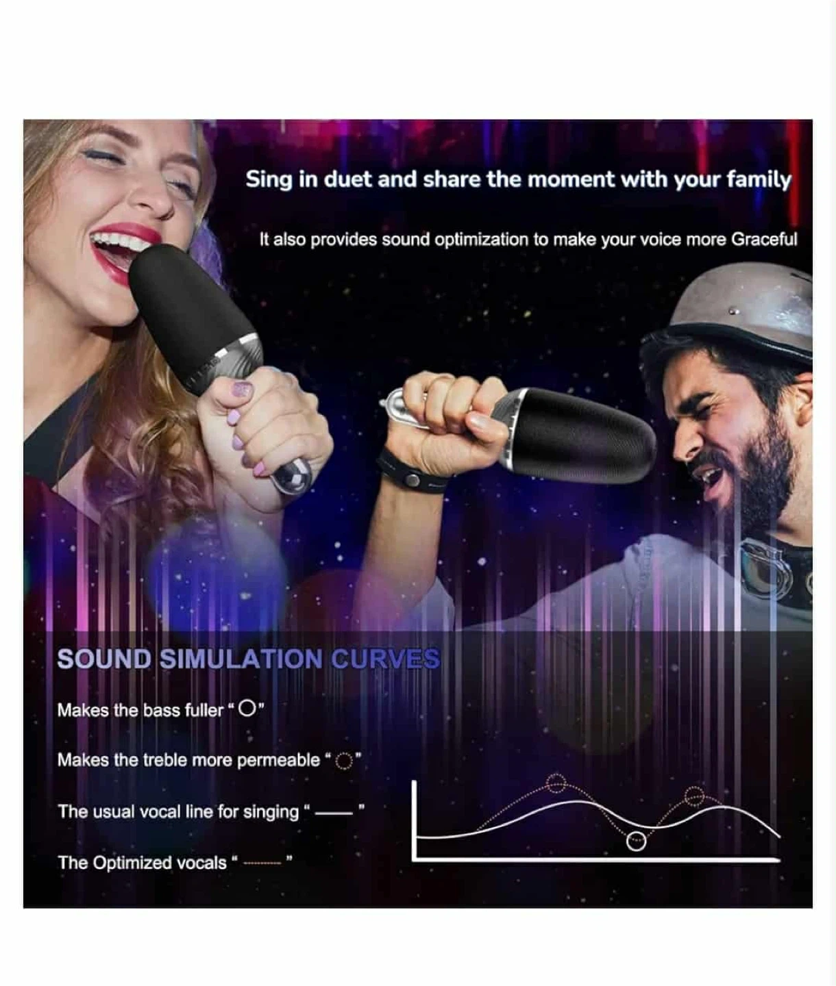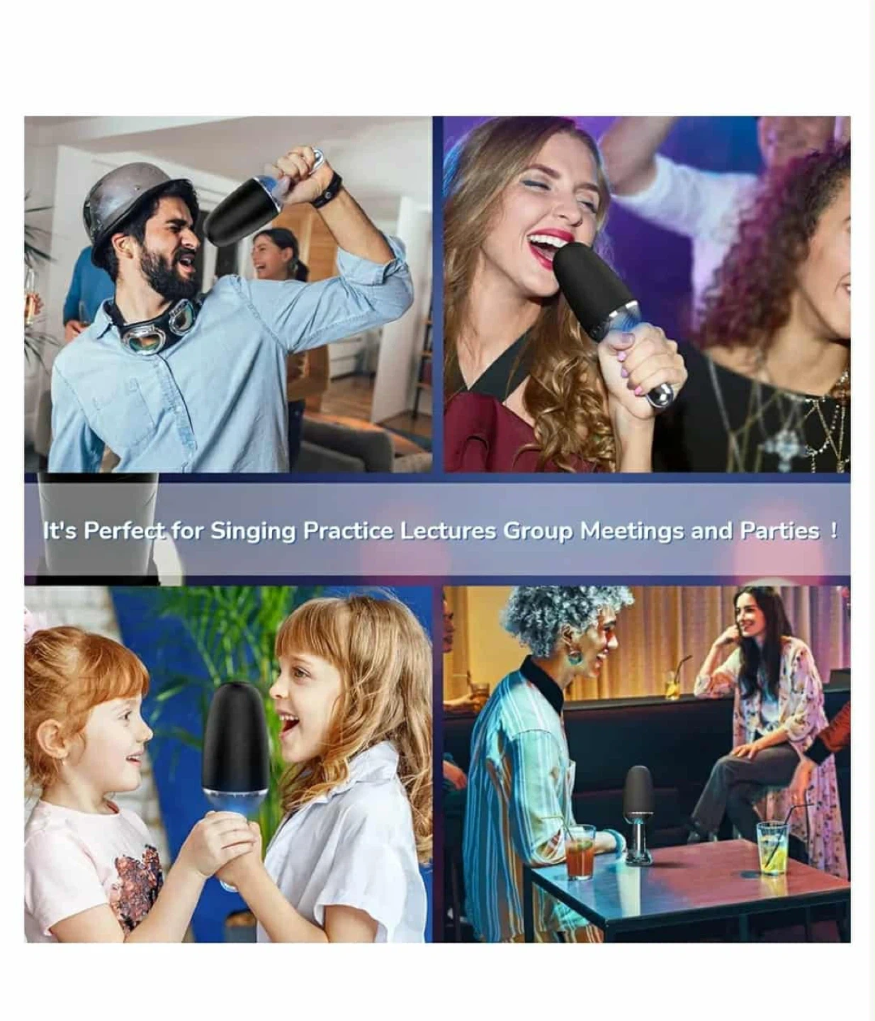 This is a portable karaoke microphone system that is wireless and has Bluetooth connectivity. It's perfect for car travel, home use, or outdoor parties. It can be used by kids, adults, PCs, and smartphones. It comes with an audio cable connection and Bluetooth connection and also comes with a case for easy storage and portability