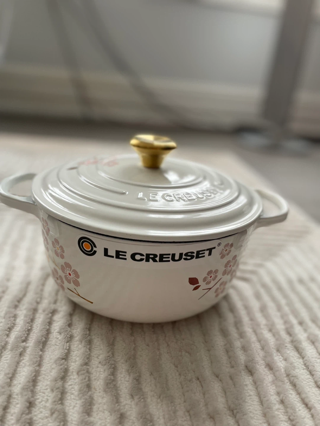 Selling Le Creuset Cocotte Ronde Signature casserole in the beautiful Sakura design! It's a lovely white colour and holds 2.4L. The dimensions are 20cm / 7 3/4 inches. It's brand new.