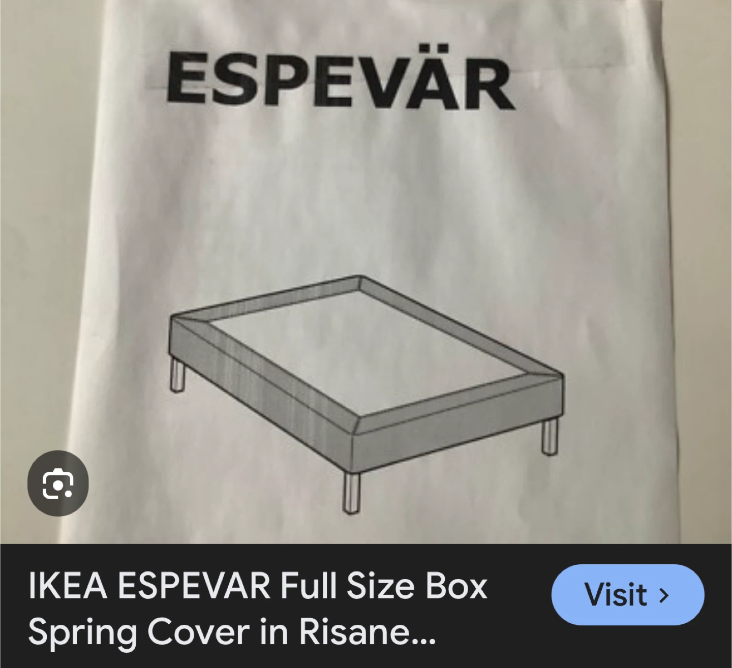 Selling an IKEA ESPEVÄR full size box spring cover (used )It's in great condition and ready to use. Perfect for protecting your box spring and adding a clean look to your bedroom!