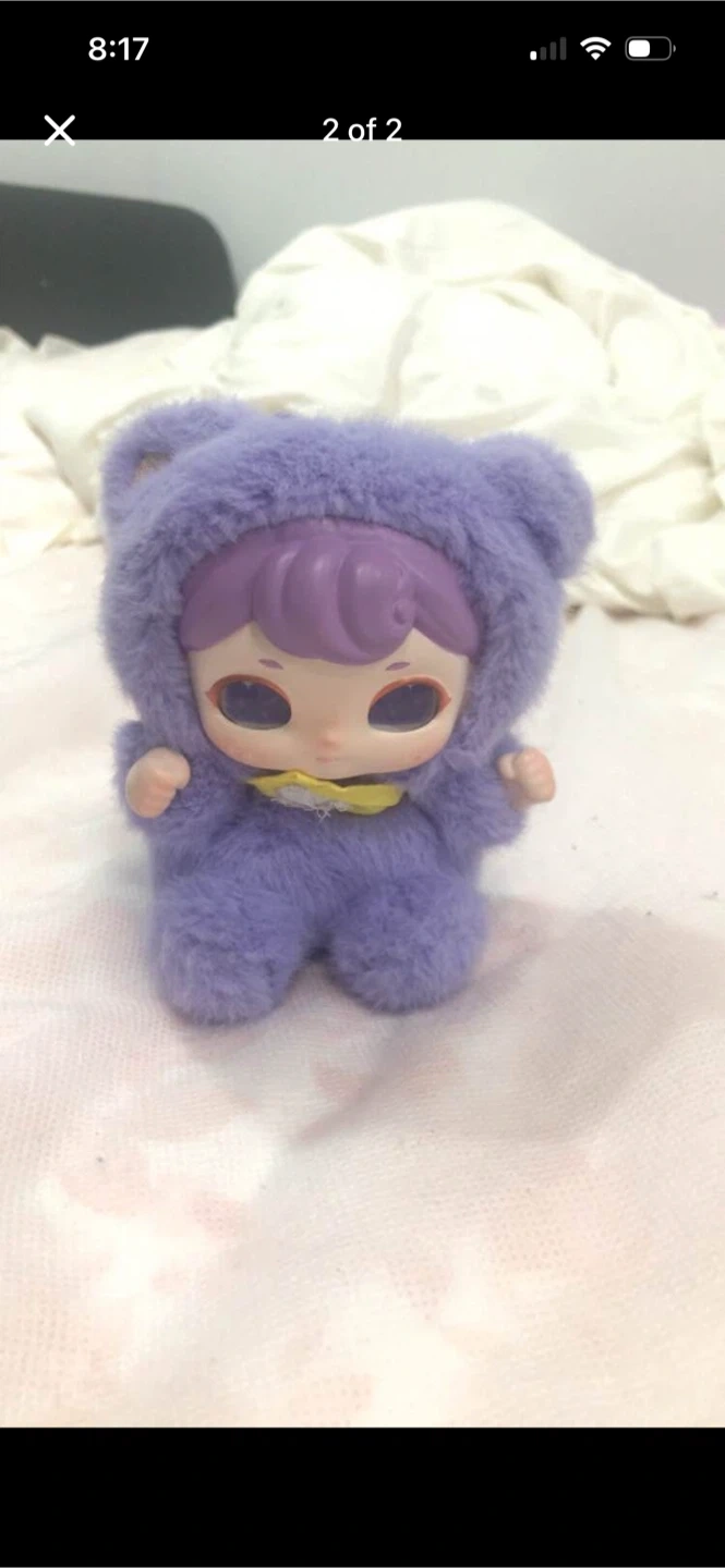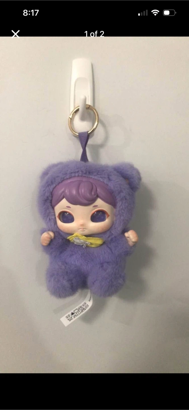 Selling a cute Crybaby plush keychain from Pop Mart! It's in great condition and ready to clip onto your bag or keys. The plush is a soft purple colour and has a little bear hood. Perfect for any Crybaby fan!