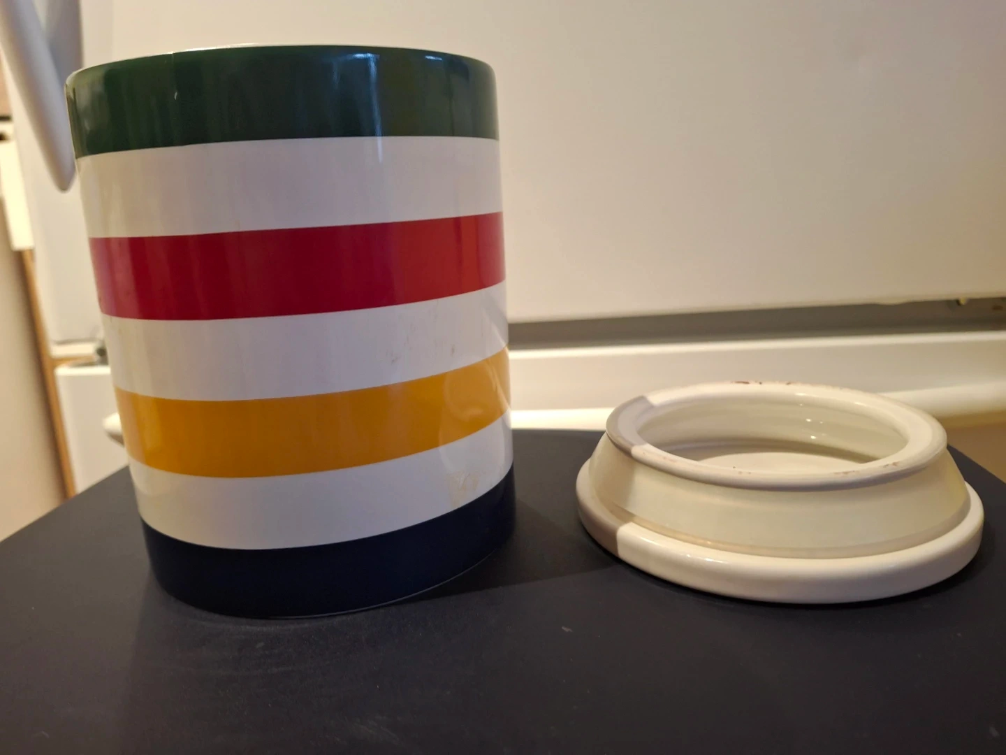 Selling a lovely HBC Stripes storage canister! It's in great shape and features the iconic Hudson's Bay Company stripes. Perfect for adding a touch of Canadiana to your kitchen or pantry