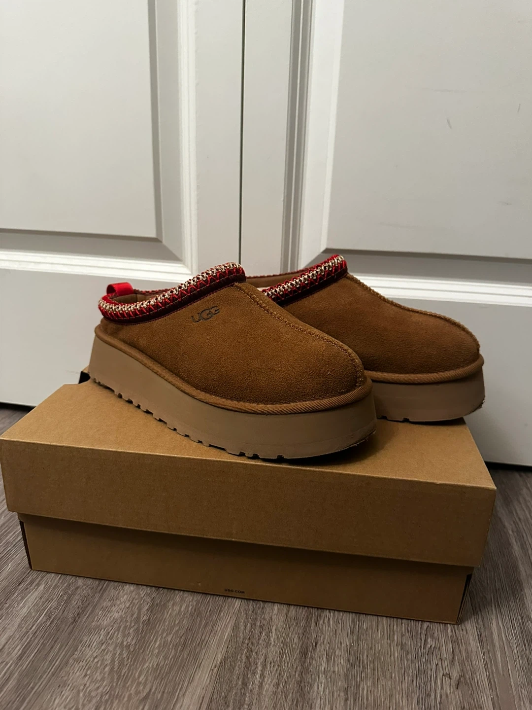 Selling a pair of UGG Women's Tasman Platform clogs in brown. These stylish and comfortable clogs come with their original box. Perfect for adding a little height and a lot of comfort to your everyday look!