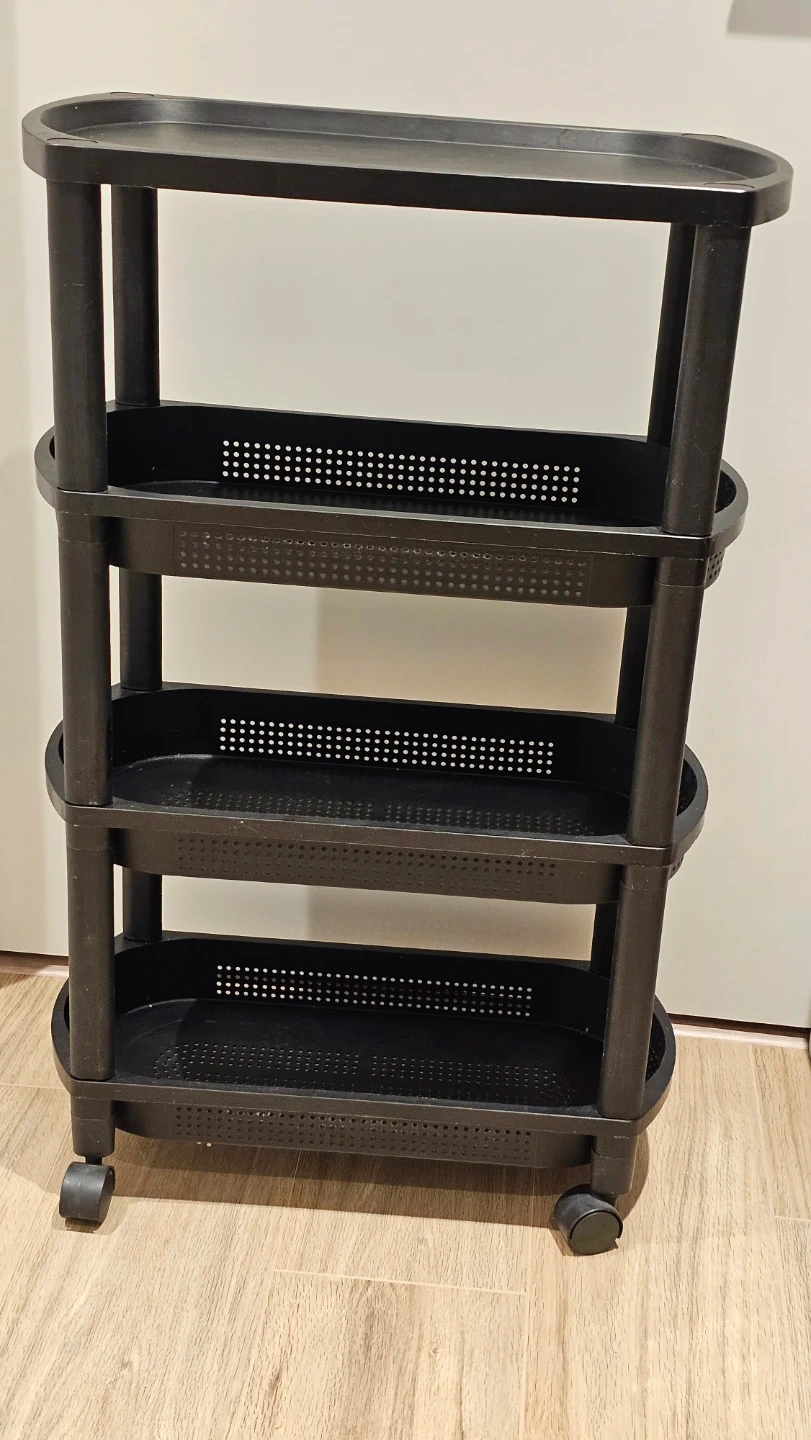 This is a handy black rolling cart with four tiers, perfect for organizing your space. It's in great shape and ready to roll into your home!