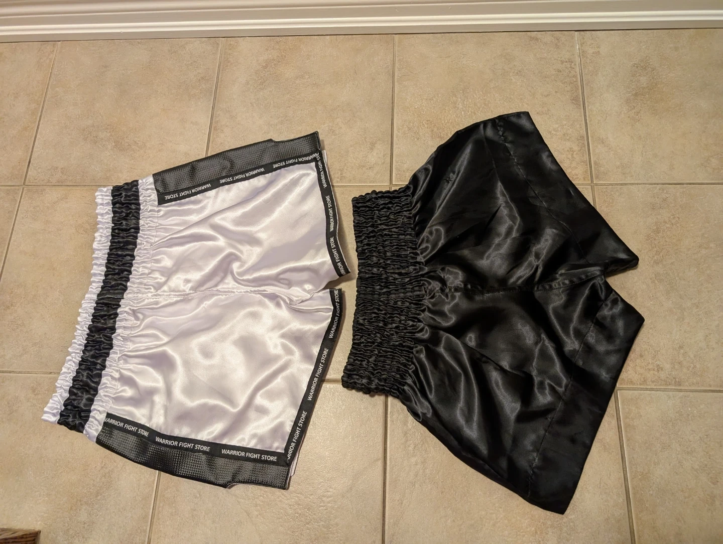 Selling a pair of Muay Thai shorts! One pair is from Fairtex and the other is from Warrior Fight Store. Both are in great condition and ready for your next training session or fight. They're perfect for anyone looking for quality and style in their combat sports gear!