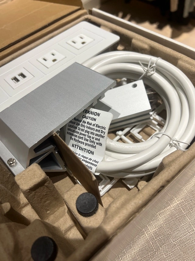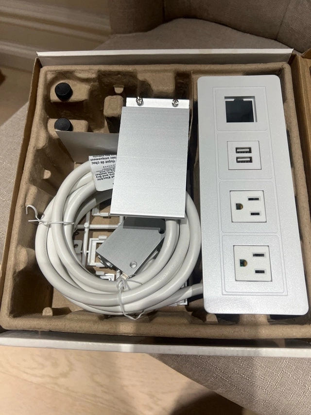 I'm selling a brand new Teknion power hub, perfect for adding convenient power and connectivity to any desk or workspace. This unit features a combination of AC power outlets, USB ports, and a network connection, all integrated into a sleek, flush-mount design. It is brand new in the box, never used. Features: * 2 AC Power Outlets * 2 USB Charging Ports * 1 Network Port