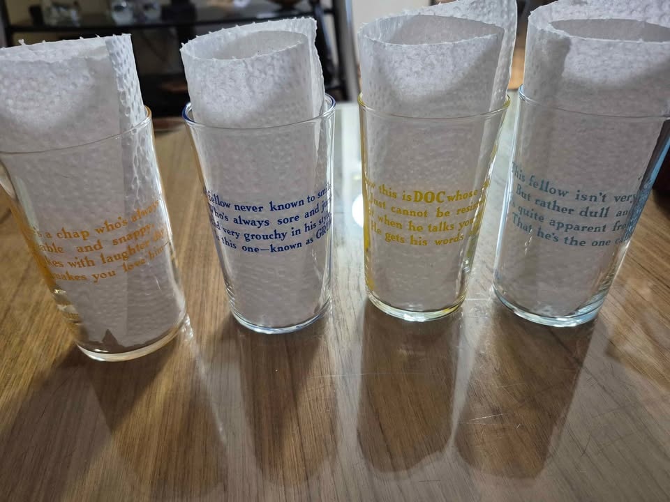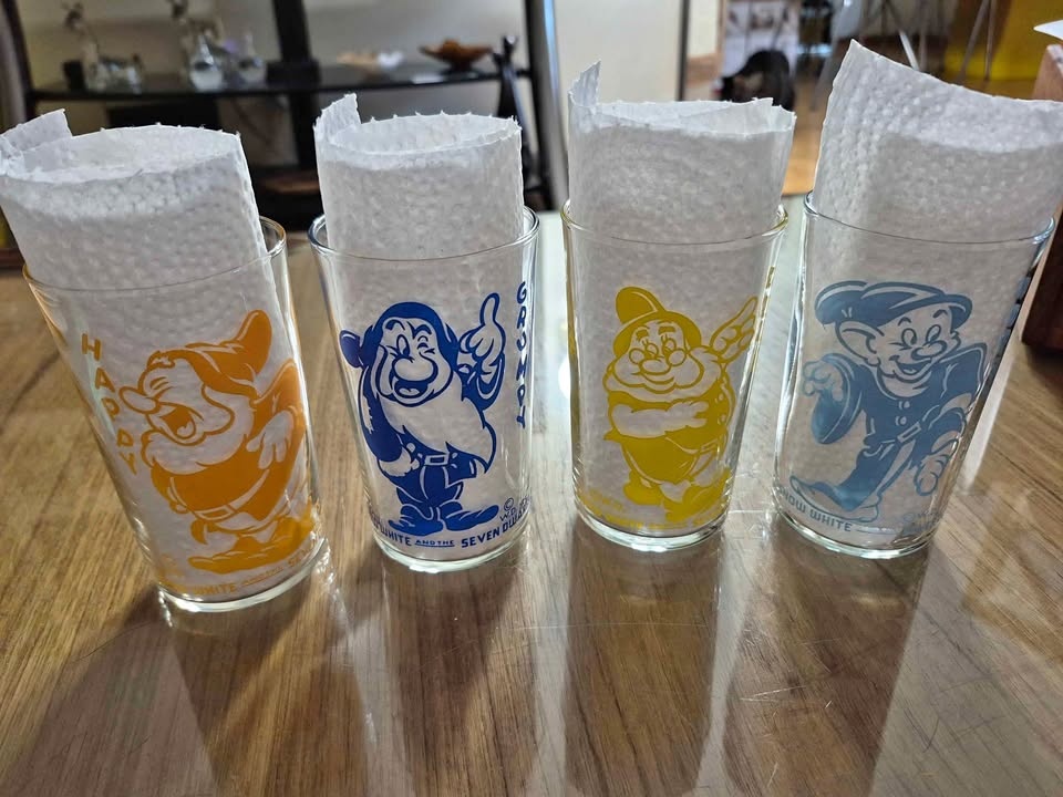 Vintage Disney Snow White and the Seven Dwarfs drinking glasses - Dopey, Grumpy, Doc & Happy - promotional items from the 1938 release of the movie.