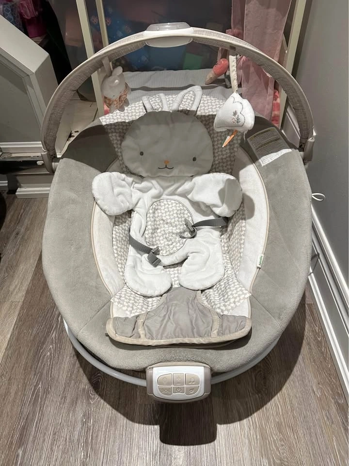 For newborns to age 6 months, or up to 20 lbs, whichever comes first. Soothing vibrations, calming melodies, nature sounds & white noise. Engaging lights on removable overhead toy bar with 2 hanging plush toys. Bunny bolster supports newborns; Remove to use as tummy time mat. 3-point safety harness keeps baby secure; 2 reclining positions keep baby comfortable. Neutral unisex design blends in with home decor. Machine washable seat pad & bolster; assembled dimensions 21.65"H x 23.03"W x 26.77"D. Lightly used, like new. Pick up only!