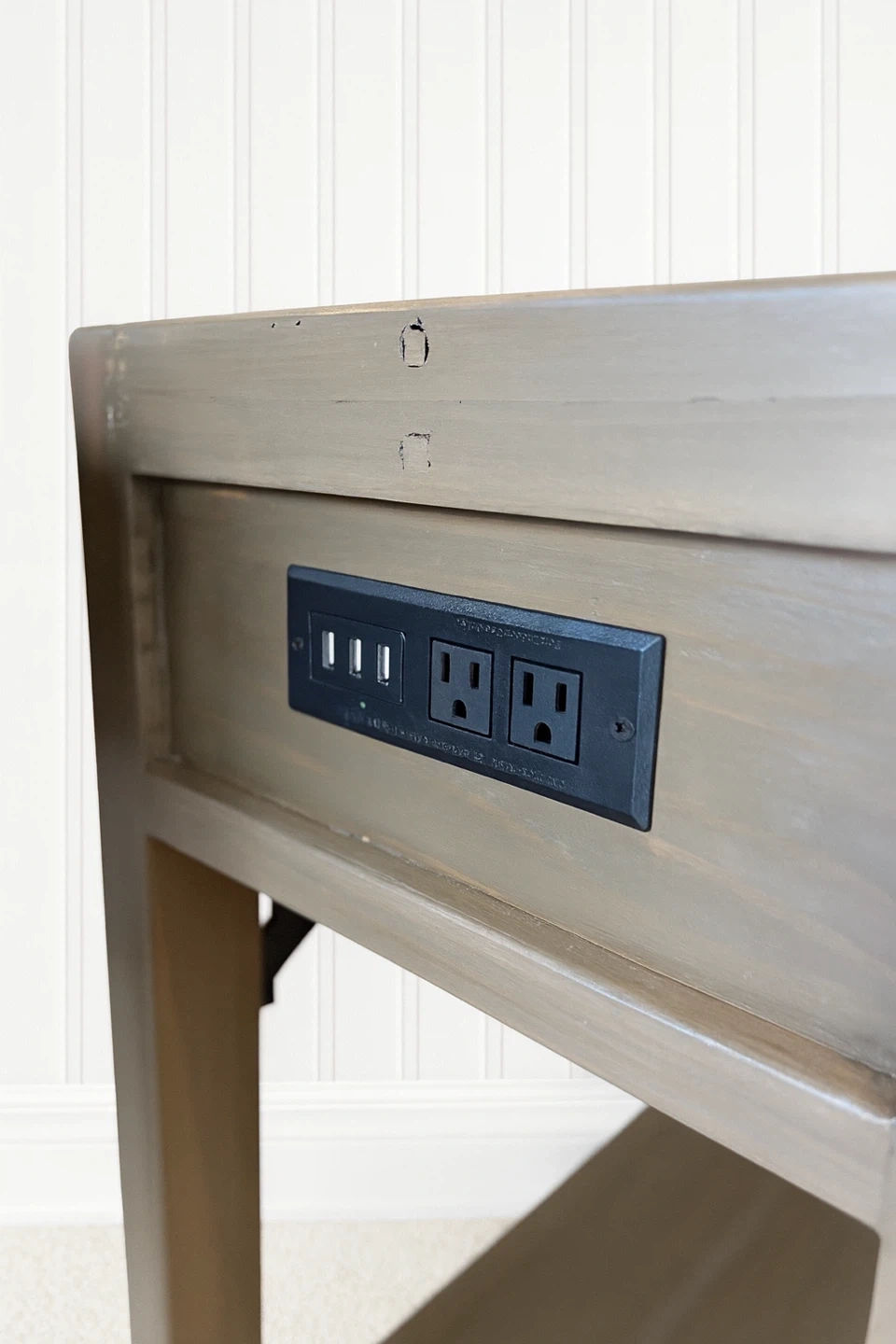Each nightstand includes a built-in power bar with outlets + USB ports so you can charge phones, tablets, lamps etc bedside.