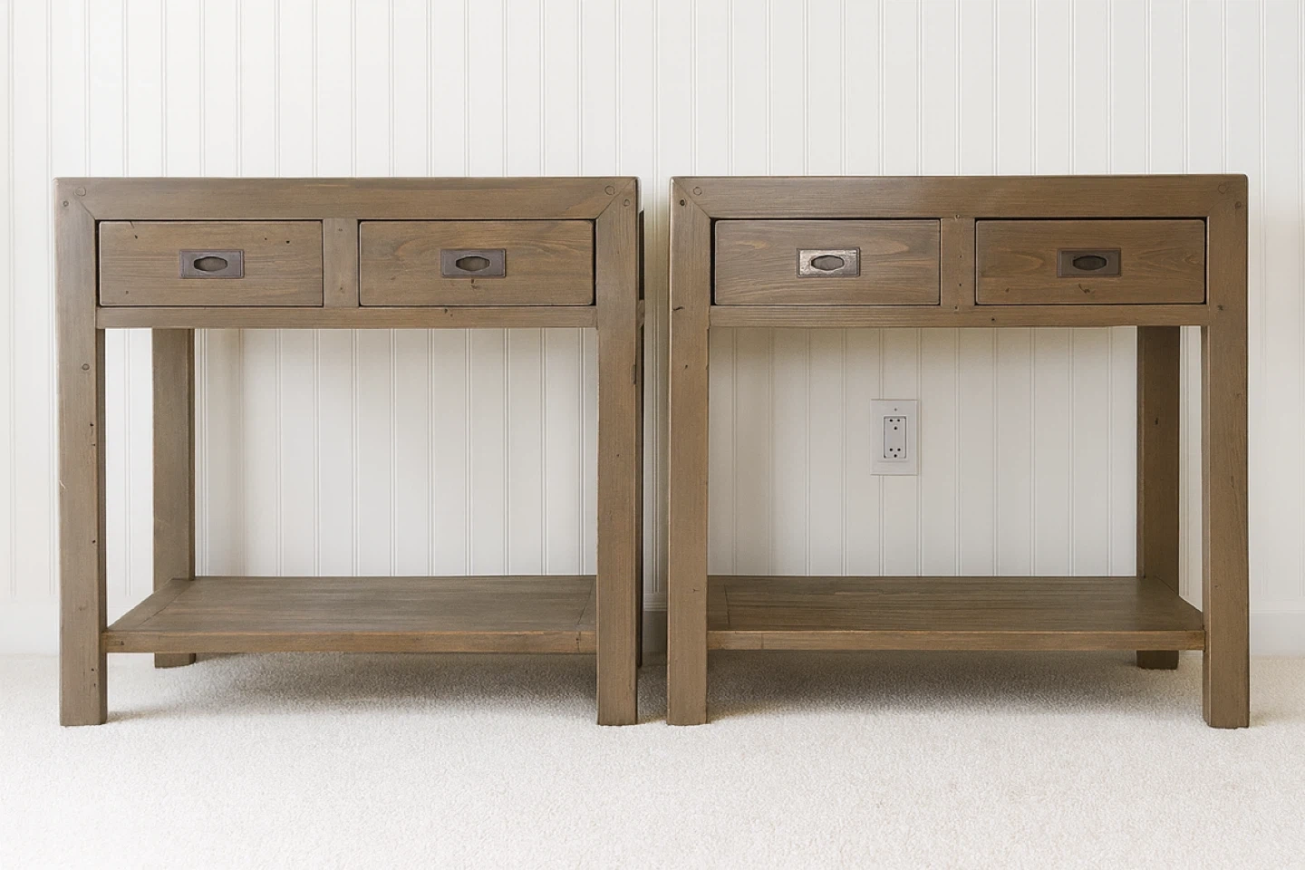 Beautiful solid-wood nightstands professionally refinished in a warm neutral tone. These are high-quality, sturdy pieces with clean modern lines — perfect for bedrooms styled in modern farmhouse, organic modern, or transitional decor.