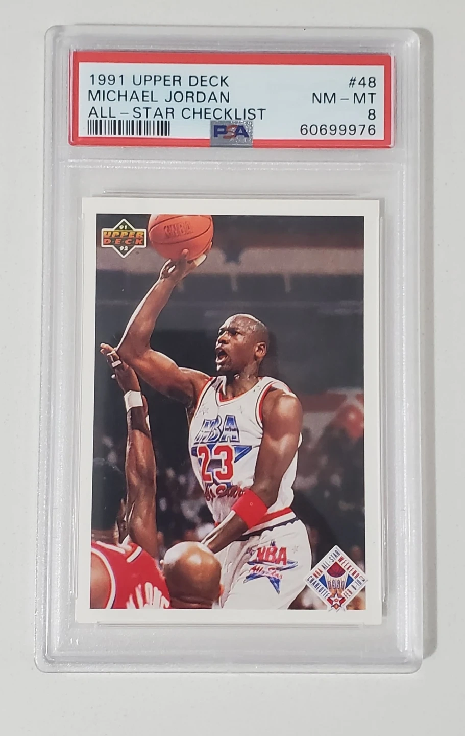 Selling a 1991 Upper Deck Michael Jordan All-Star Checklist card, graded PSA 8. It's in NM-MT condition and ready for a new collector!