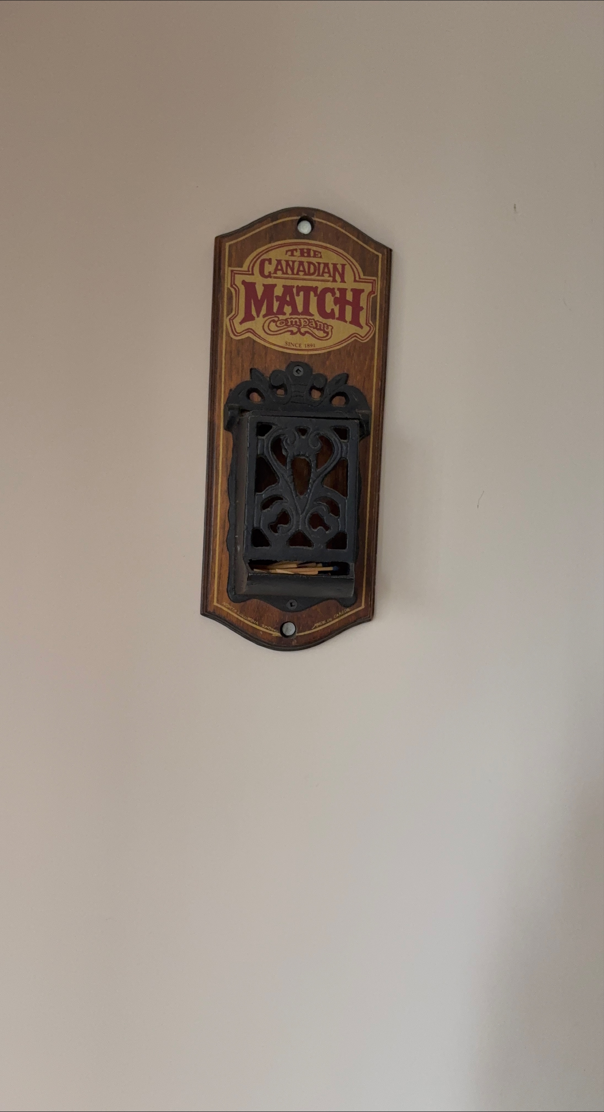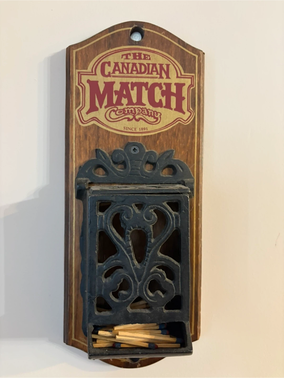 Here's a vintage match holder from The Canadian Match Company! It's a cool piece with a wooden back and a metal holder. It says 'Made in Canada' at the bottom.