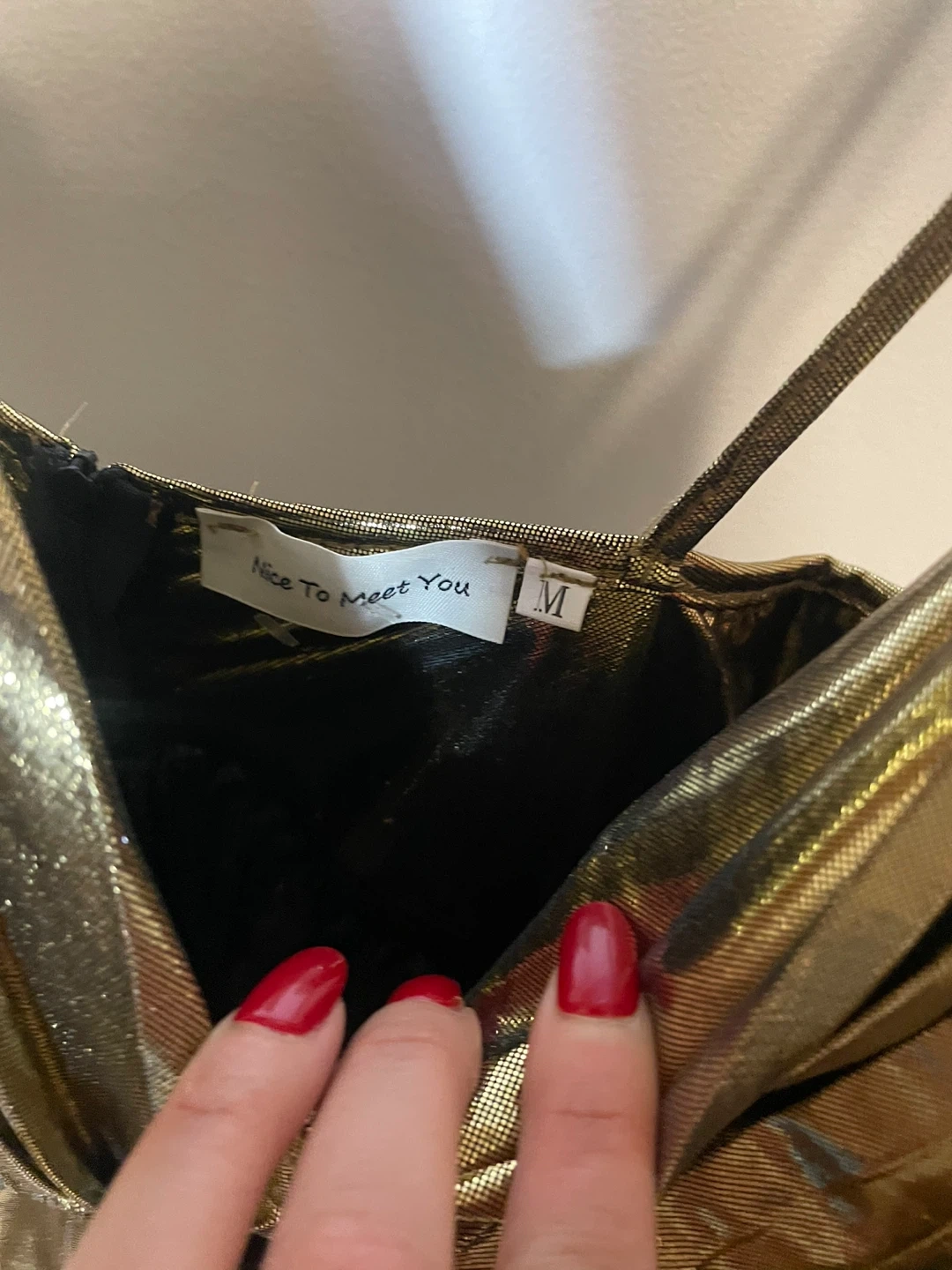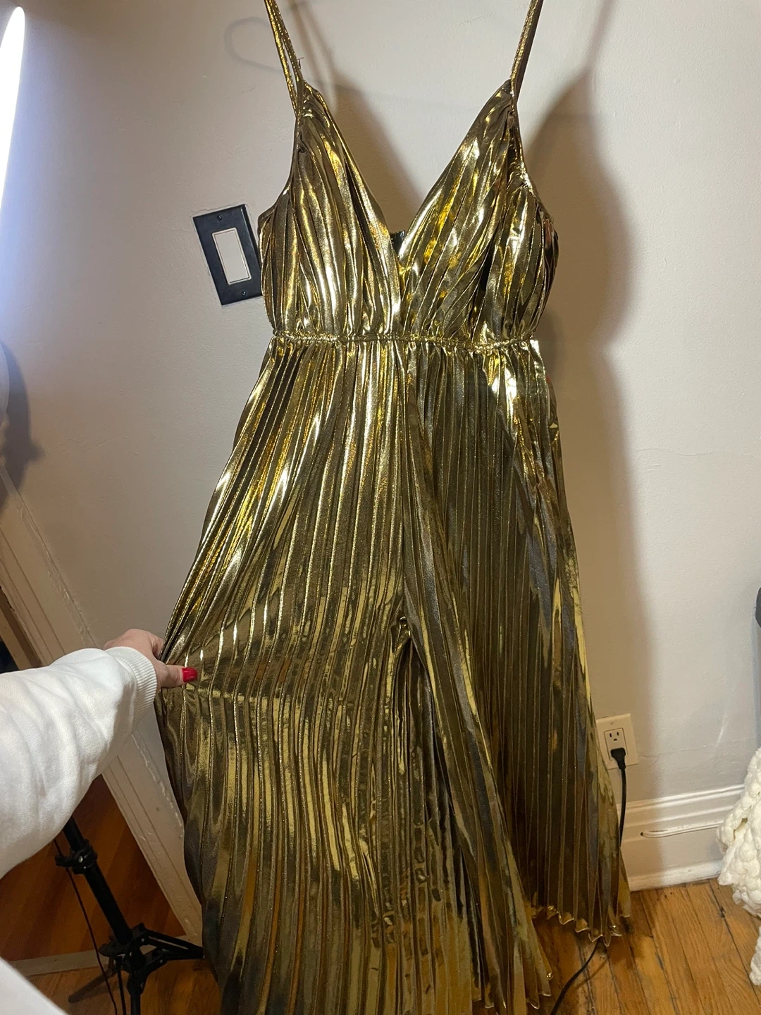 Selling a stunning gold jumpsuit from Nice To Meet You! It's a size medium and in great condition. The pleated texture catches the light beautifully, making it perfect for a night out or a special occasion. It's a real showstopper!