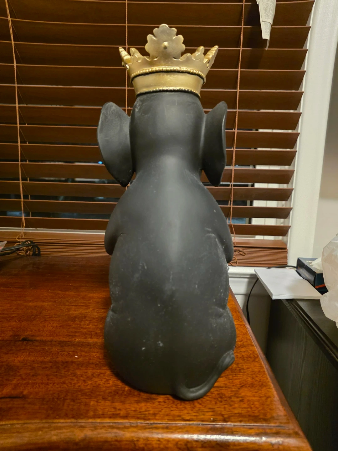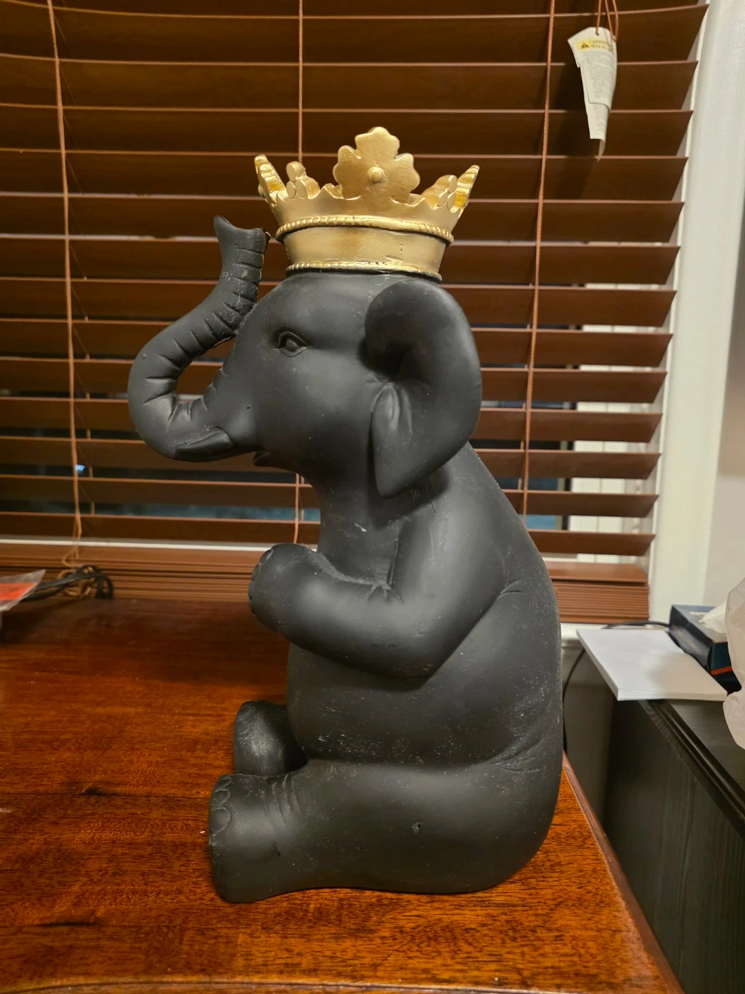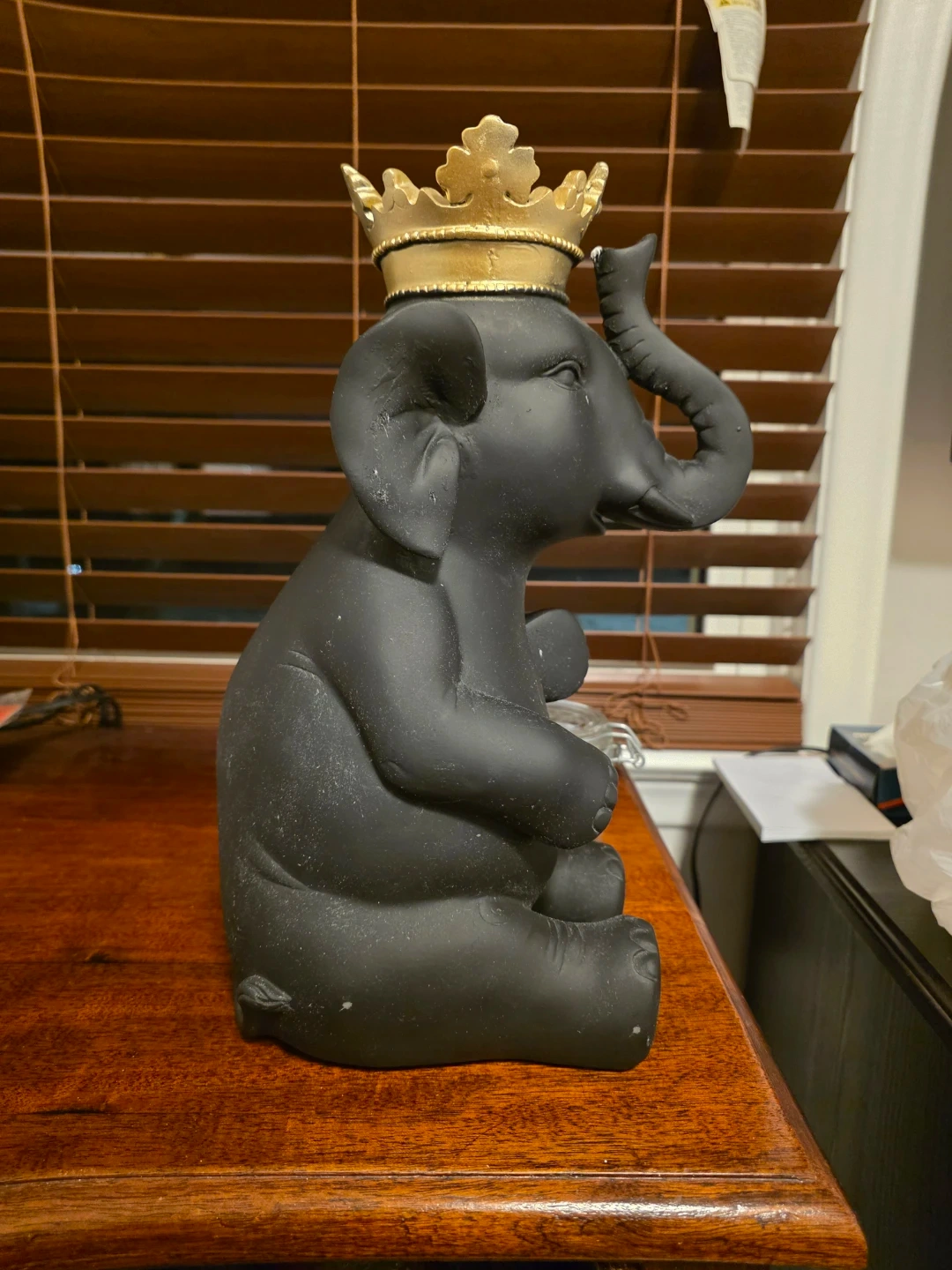 This charming black elephant statue, adorned with a golden crown, brings a touch of regal whimsy to any space. The statue is in good condition and ready to find a new home.