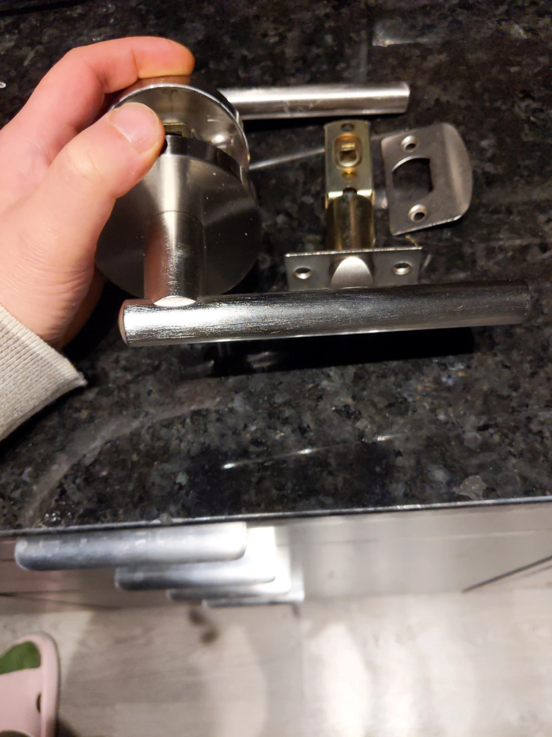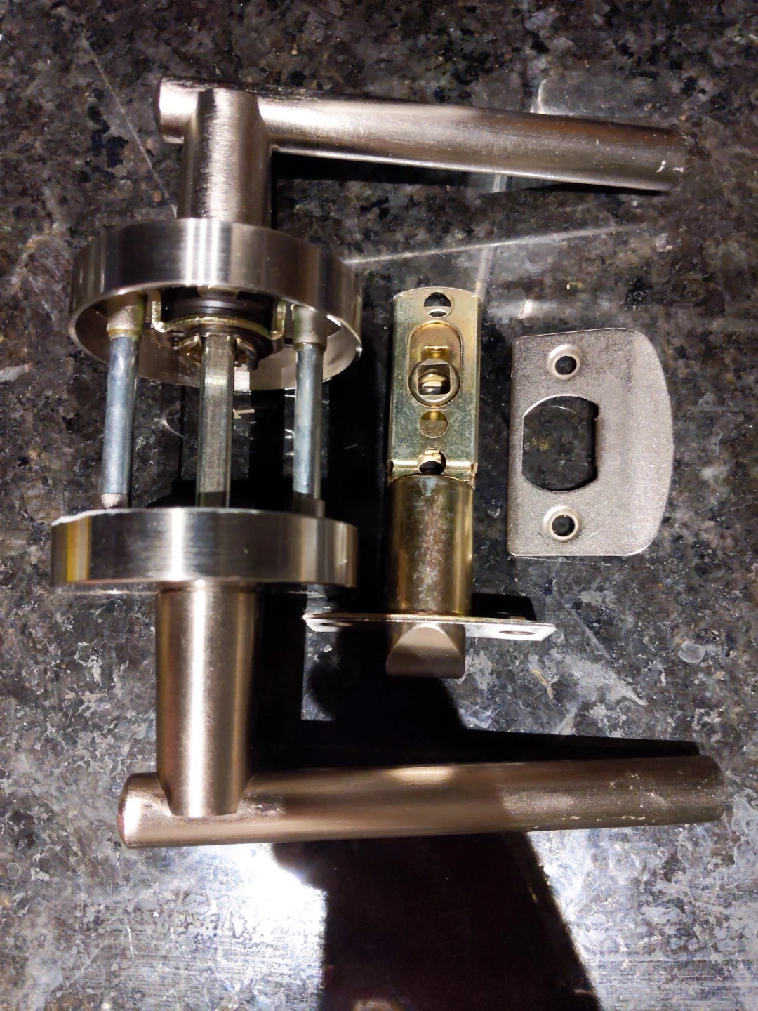 Selling a door handle set in silver. It includes the handle, latch, and strike plate. One of them locks from the inside suitable for bathroom. Good condition!