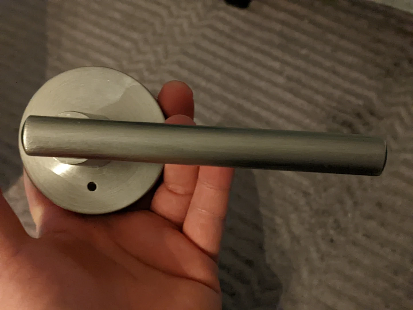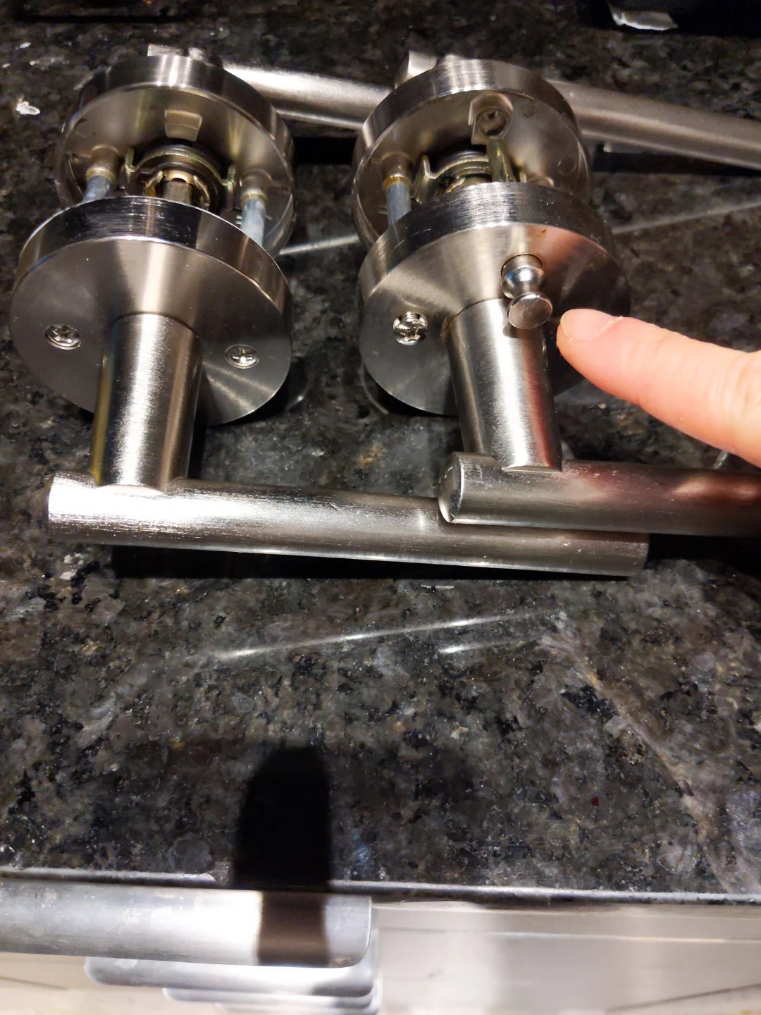 Selling a door handle set in silver. It includes the handle, latch, and strike plate. One of them locks from the inside suitable for bathroom. Good condition!