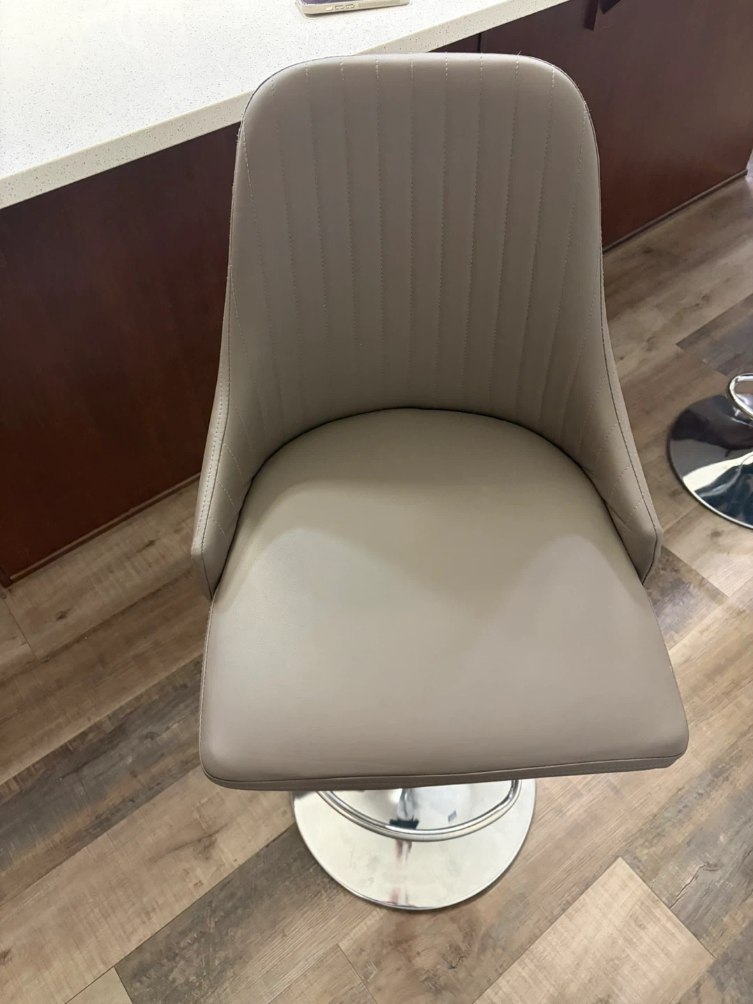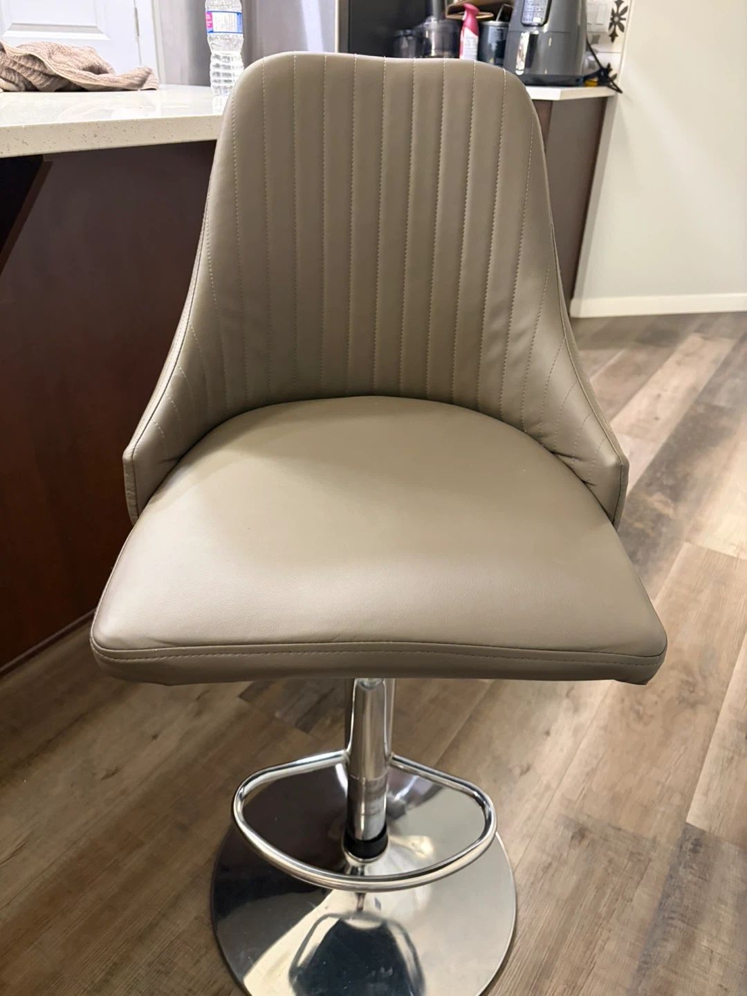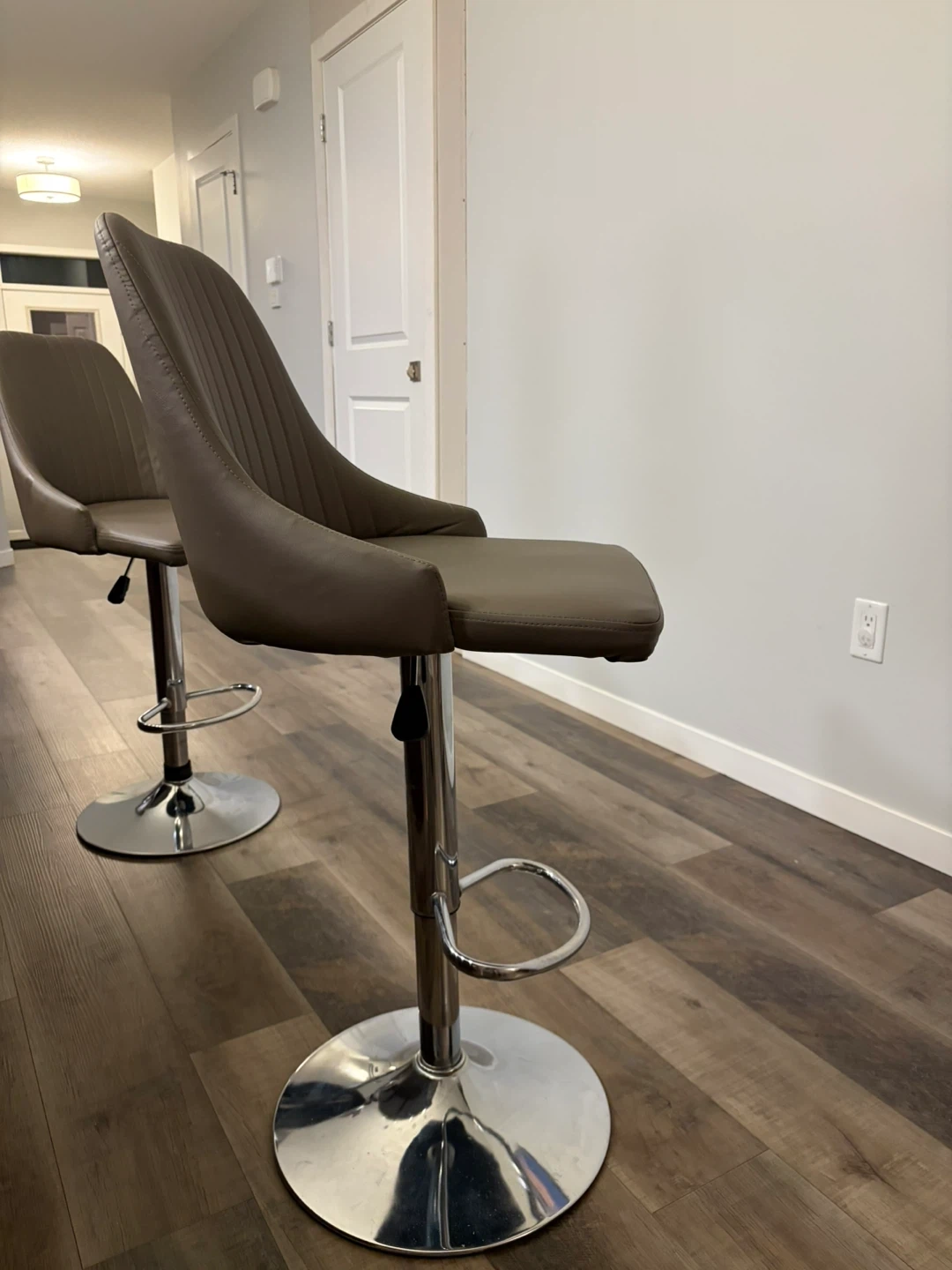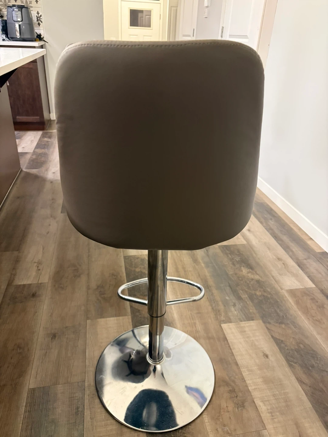 Selling a gently used adjustable height bar stool. It has a sleek design with a chrome base and a comfortable grey seat. Perfect for adding a modern touch to your kitchen or bar area!