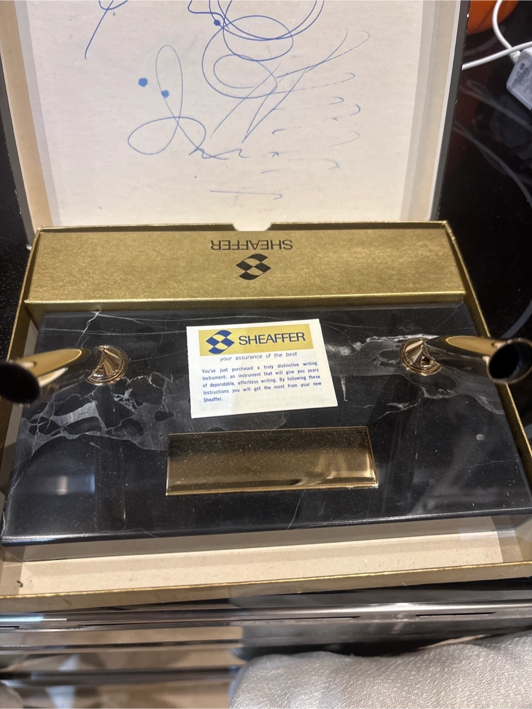 Selling a vintage Sheaffer desk pen set. It comes with a pen and a marble base. The set is in its original box! With 2 original pens