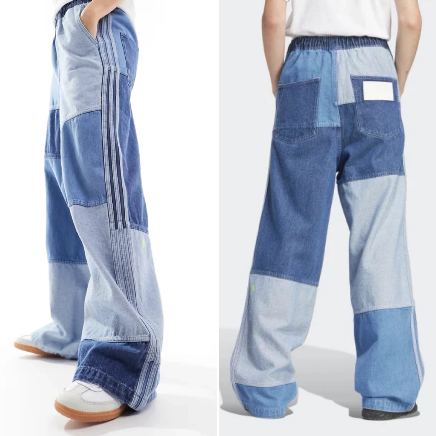 These Adidas jeans showcase a striking patchwork design in various shades of blue, offering a relaxed wide-leg fit for ultimate comfort. The elastic waistband ensures a snug fit, making them perfect for casual outings!