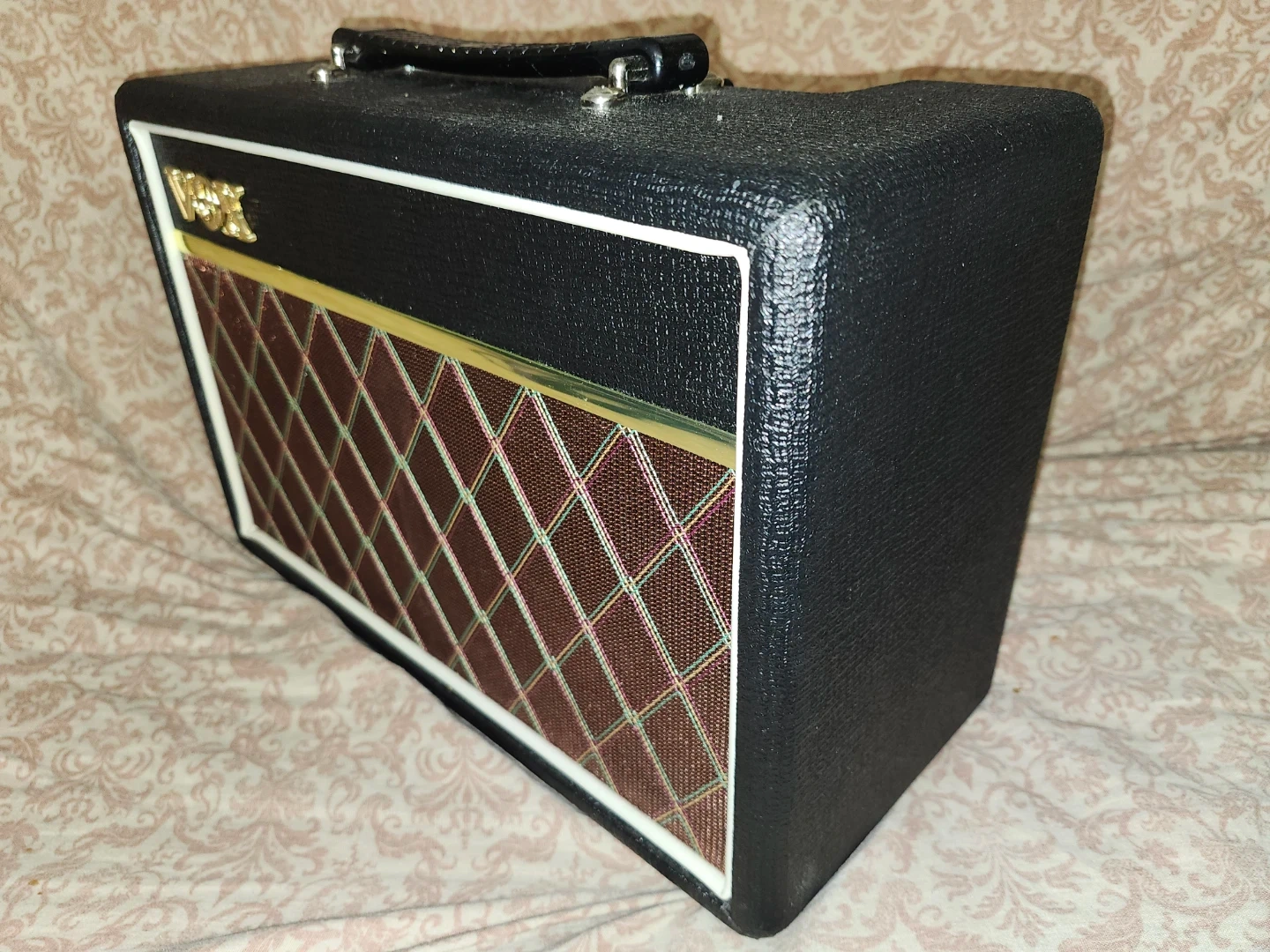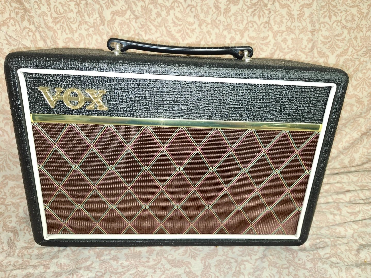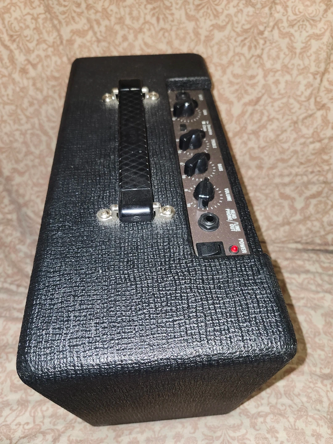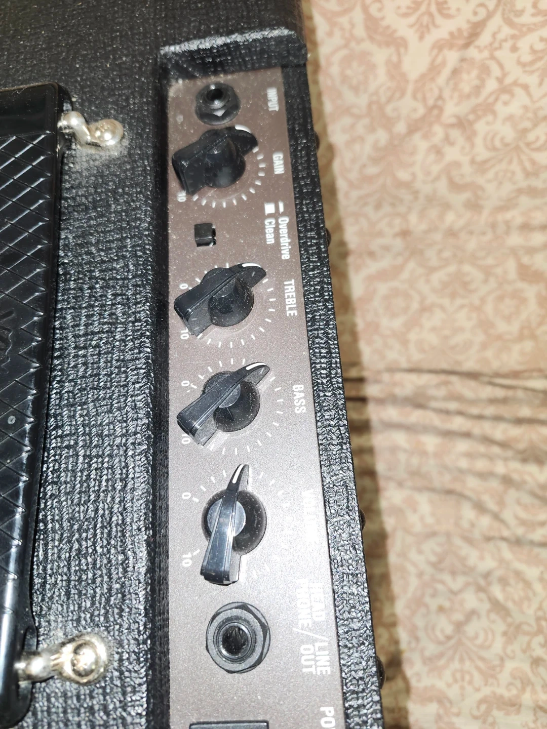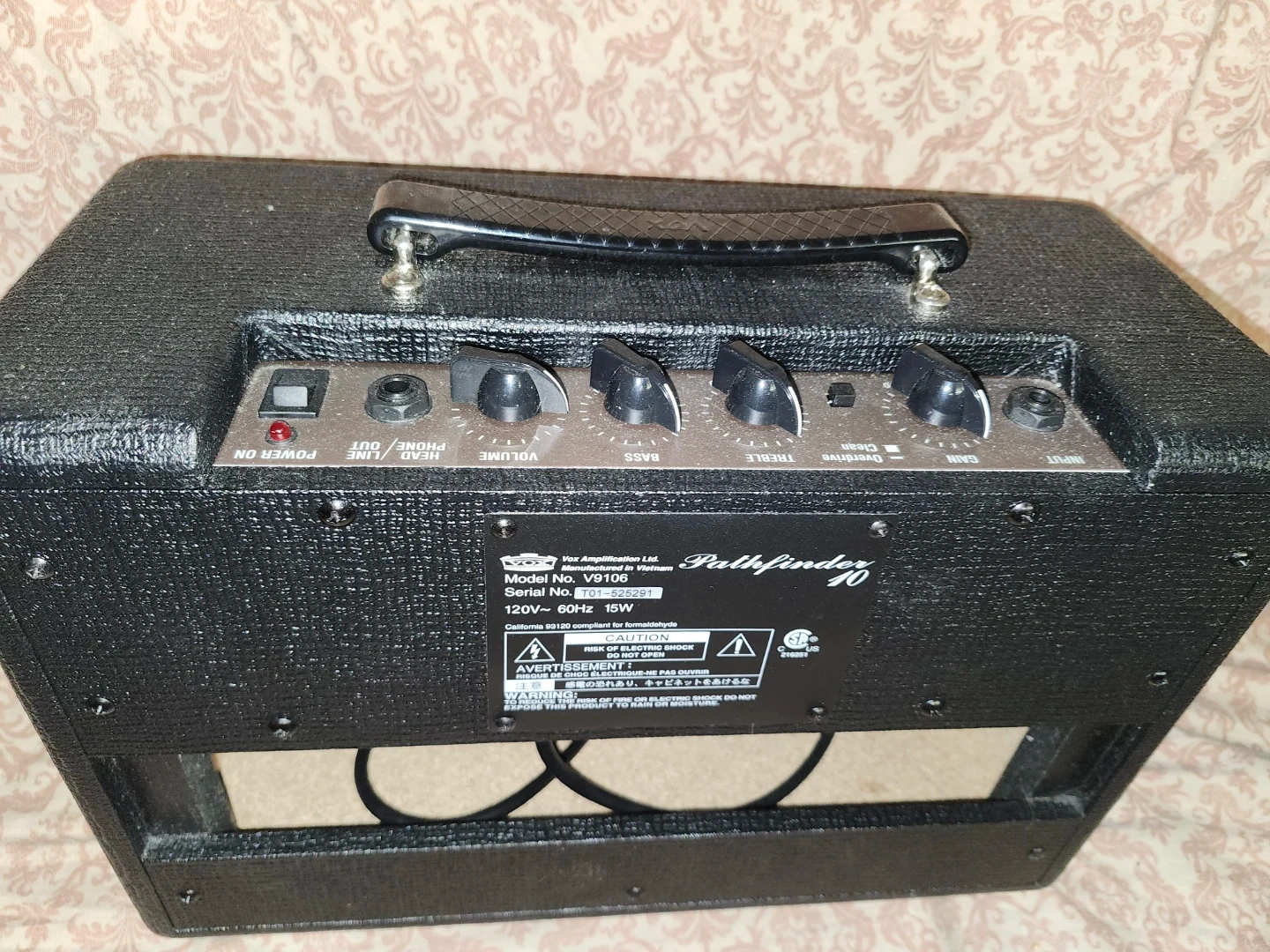 Selling a Vox Pathfinder 10 guitar amplifier. It's in good condition and ready to use! Great for practice or small gigs. Features include volume, bass, treble, and gain controls, as well as a clean/overdrive switch. Perfect for any guitarist!