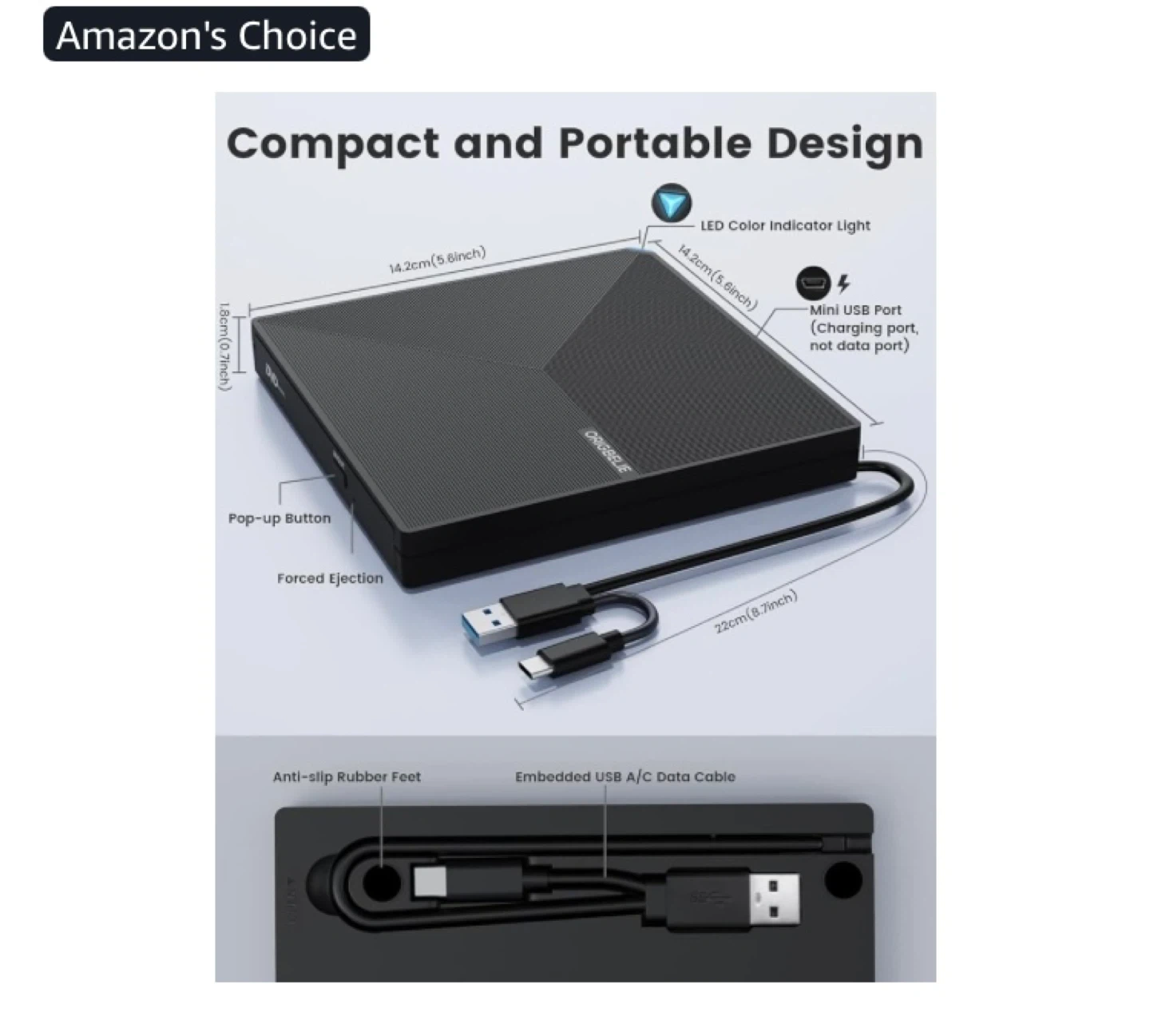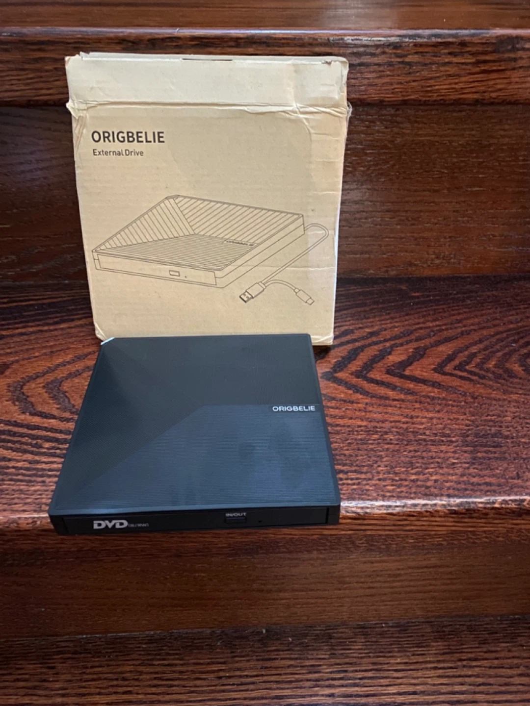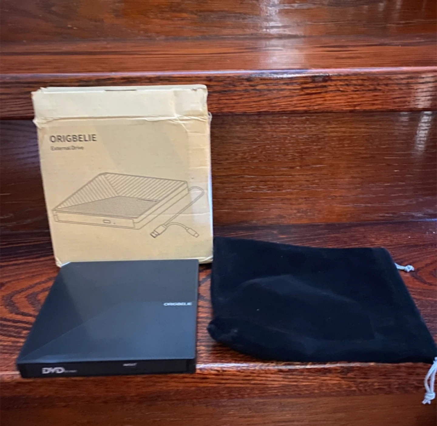 Selling an Origbelie external drive in excellent condition! It's a USB 3.0 high-speed drive, perfect for CDs, DVDs, and VCDs. It's compact and portable, measuring 14.2cm (5.6 inches) x 14.2cm (5.6 inches) x 1.8cm (0.7 inches). It comes with an embedded USB A/C data cable and a mini USB port for charging. Also includes the original box!