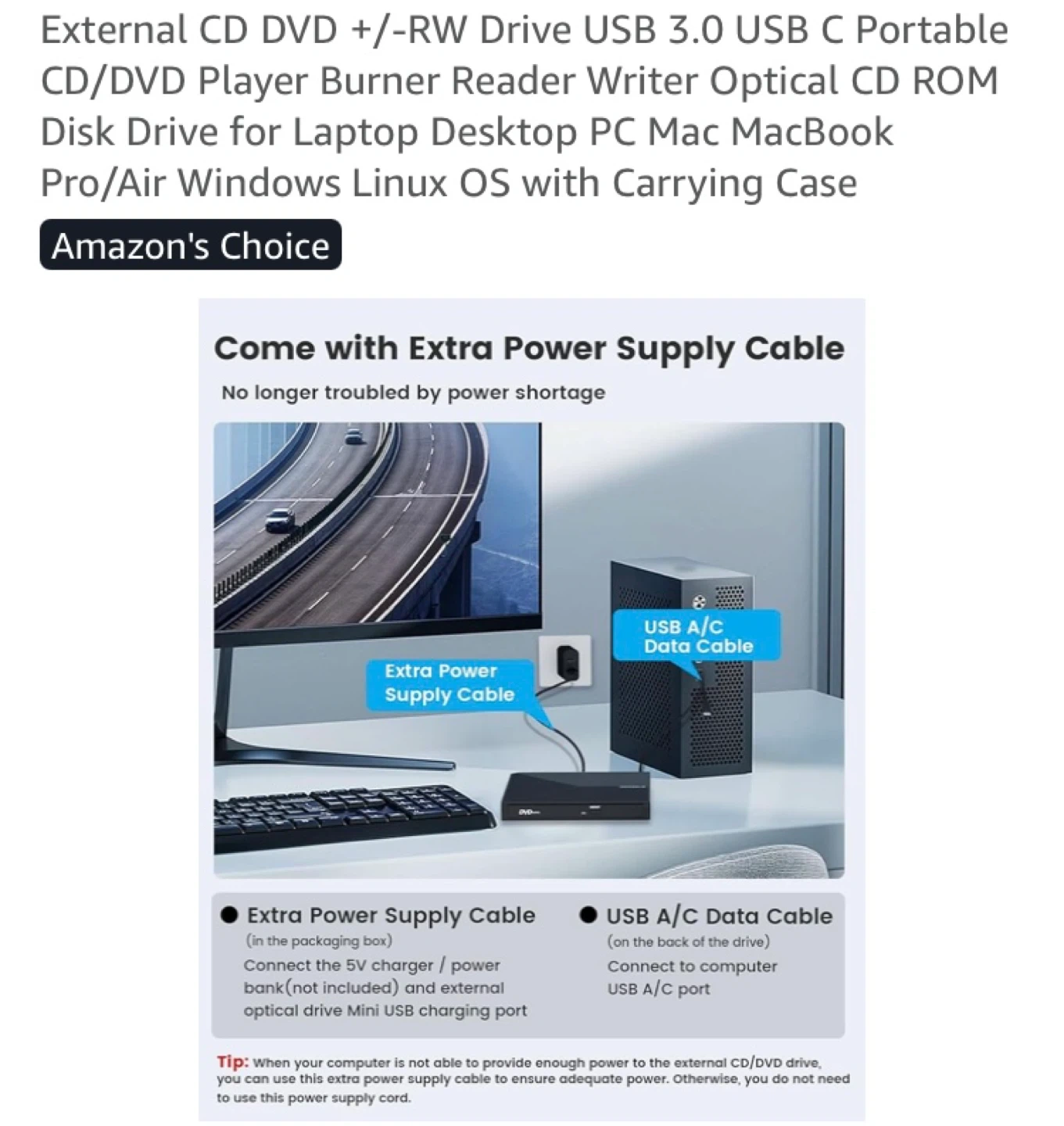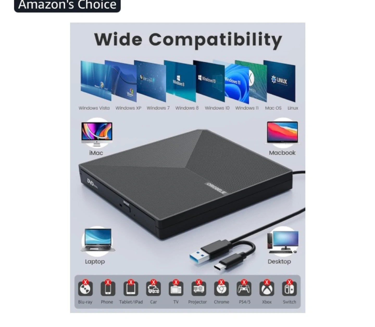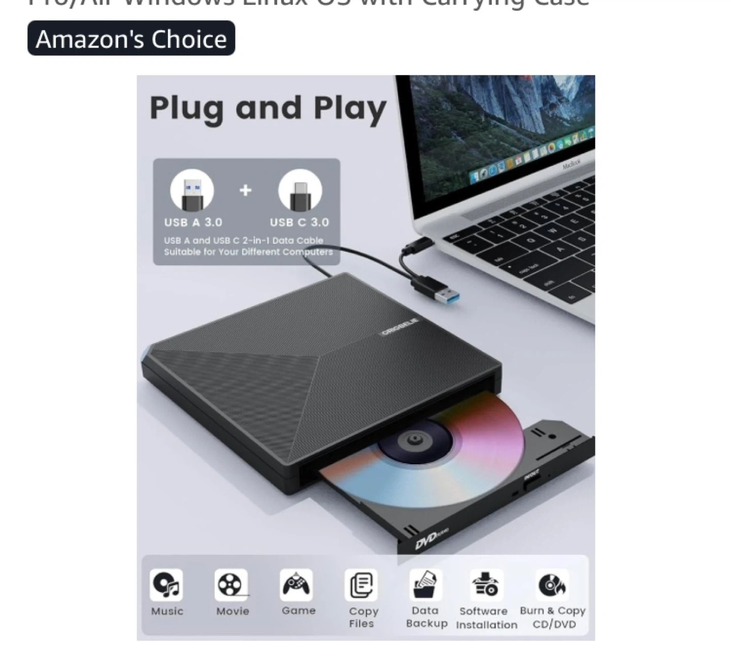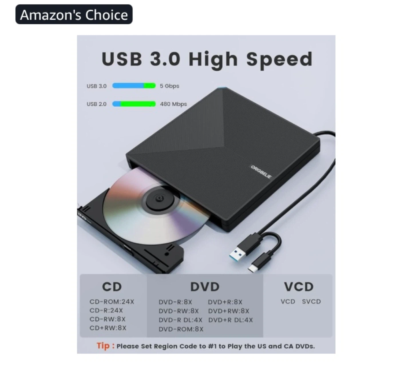 Selling an Origbelie external drive in excellent condition! It's a USB 3.0 high-speed drive, perfect for CDs, DVDs, and VCDs. It's compact and portable, measuring 14.2cm (5.6 inches) x 14.2cm (5.6 inches) x 1.8cm (0.7 inches). It comes with an embedded USB A/C data cable and a mini USB port for charging. Also includes the original box!