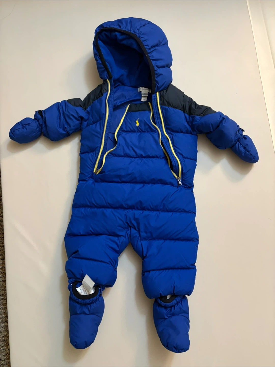 Keep your little one warm this winter with this adorable Ralph Lauren snowsuit! It's a size 6M and features a cozy hood and cute design. Perfect for snowy days and outdoor adventures!