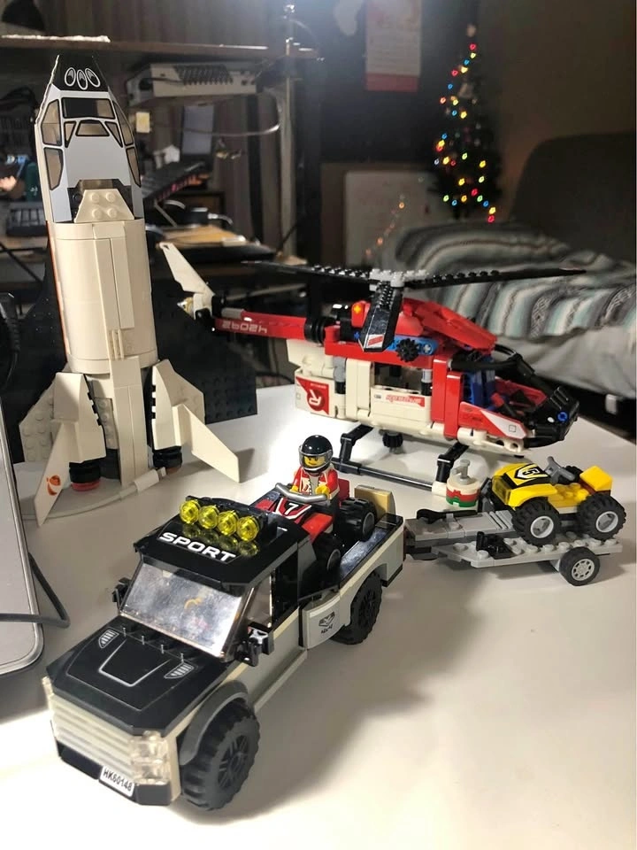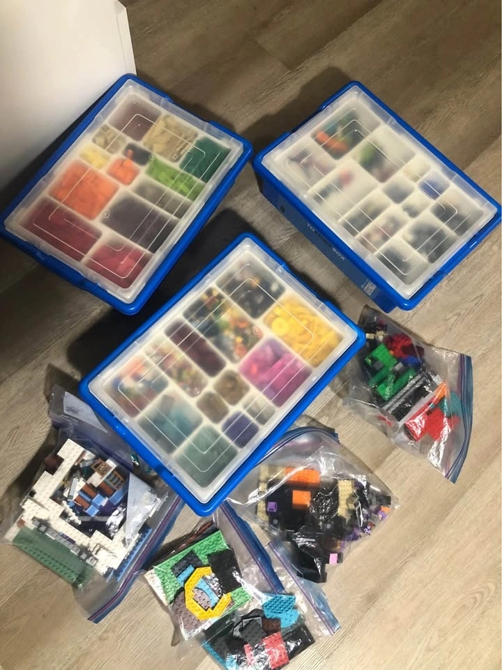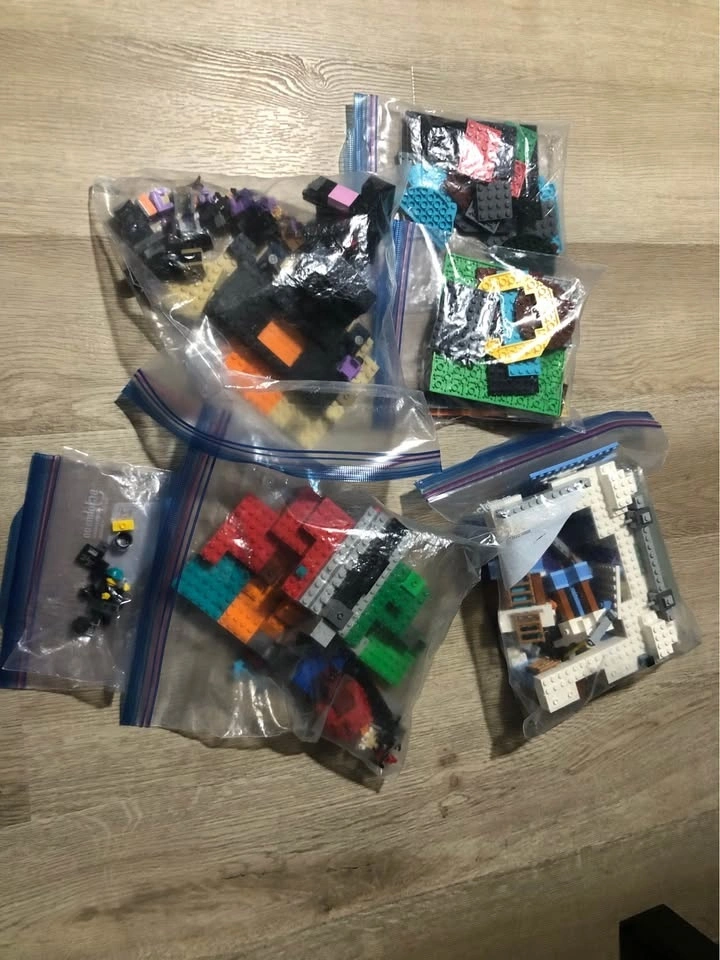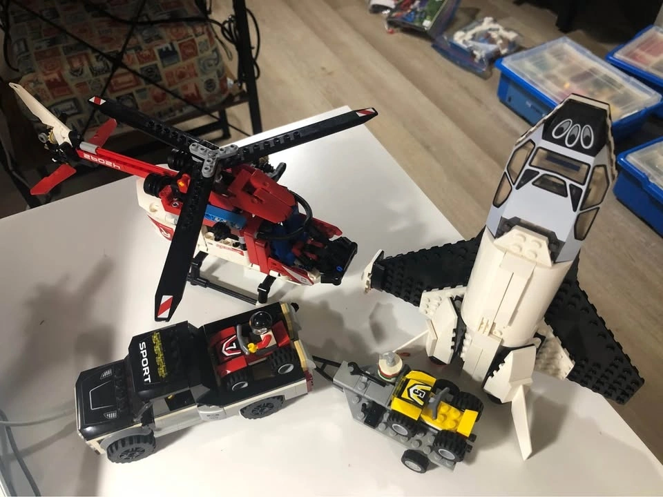 Assorted Lego sets with vehicles, helicopter, rocket and Minecraft sets. Includes loose pieces and storage containers. In good condition. Some sets missing some decorative pieces. Minecraft sets are not complete (missing some mini figures and pieces).