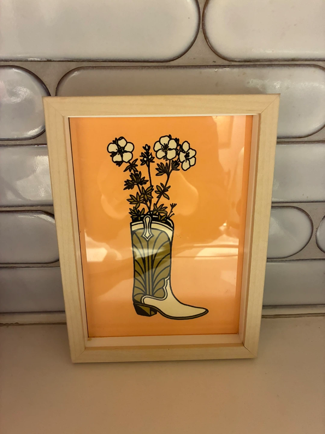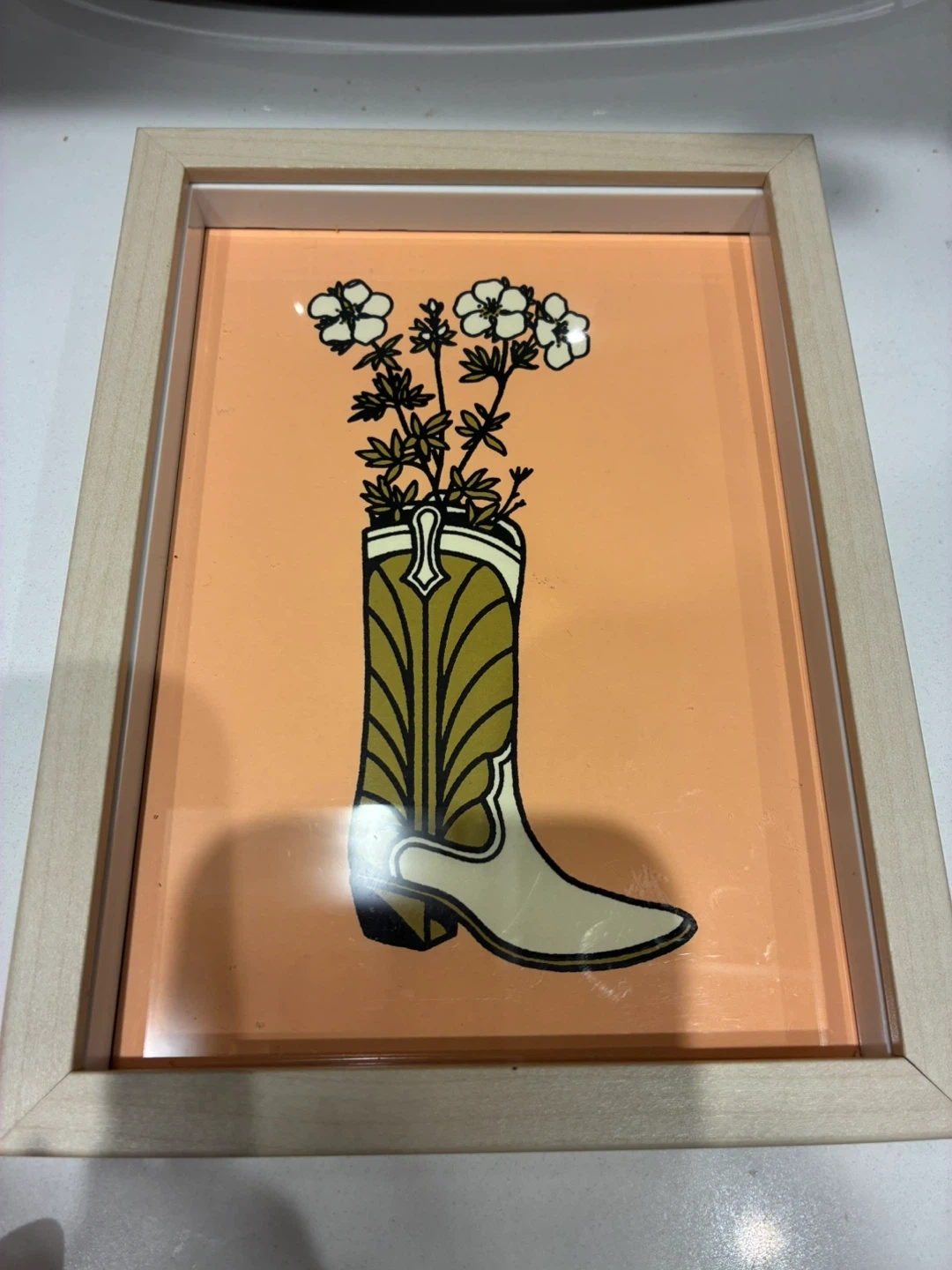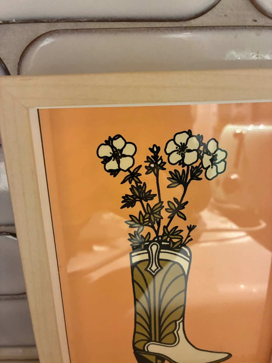 Cute framed print featuring a cowboy boot with flowers. It's in great shape and ready to add a touch of charm to your space!
