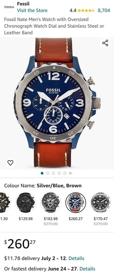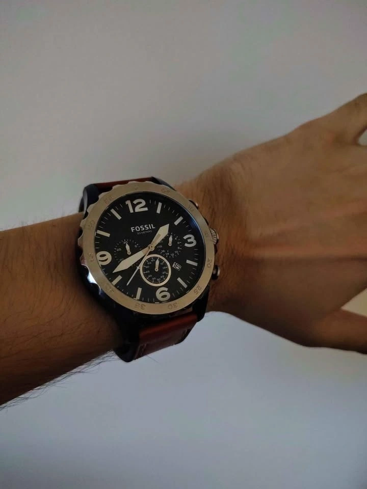 Fossil Nate Oversized Chronograph Brown Leather Watch. Amazon price is currently $260.27+Tax. Genuine Leather Strap. 50 Meters Water Resistance. (Needs battery replacement). Comes with the original Fossil case. Case material: Stainless Steel. Case diameter: 50 millimeters. Case Thickness: 12 millimeters. Band Material: Leather. Band width: 24 millimeters. Bezel material: Stainless Steel. Pickup: Queen and Woodbine, The Beaches, near Downtown Toronto