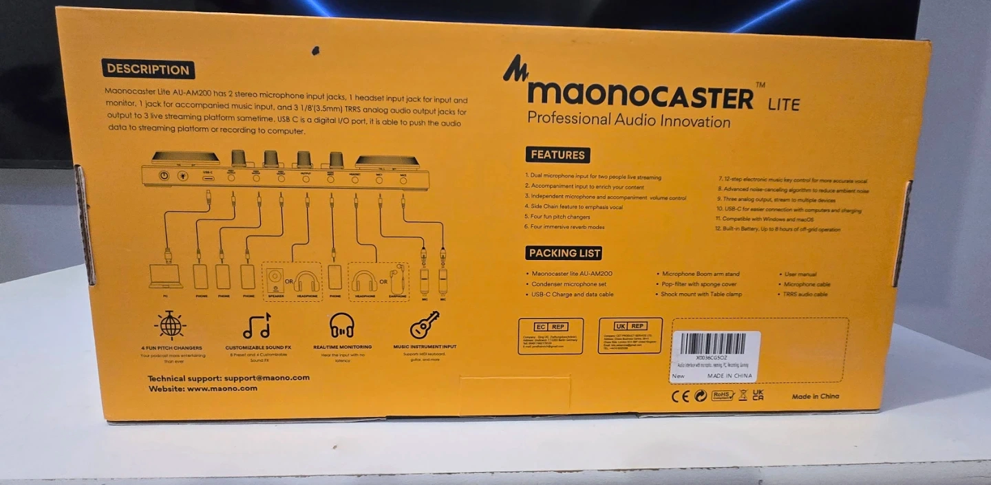 It's a professional audio innovation with a portable podcast console and condenser studio microphone. The MaonoCaster Lite AU-AM200 has 2 stereo microphone input jacks, 1 headset input jack for input and monitor, 1 jack for accompanied music input, and 3 1/8" (3.5mm) TRRS analog audio output jacks for output to 3 live streaming platforms simultaneously. USB-C is a digital I/O port. It is able to push the audio data to streaming platform or recording to computer.