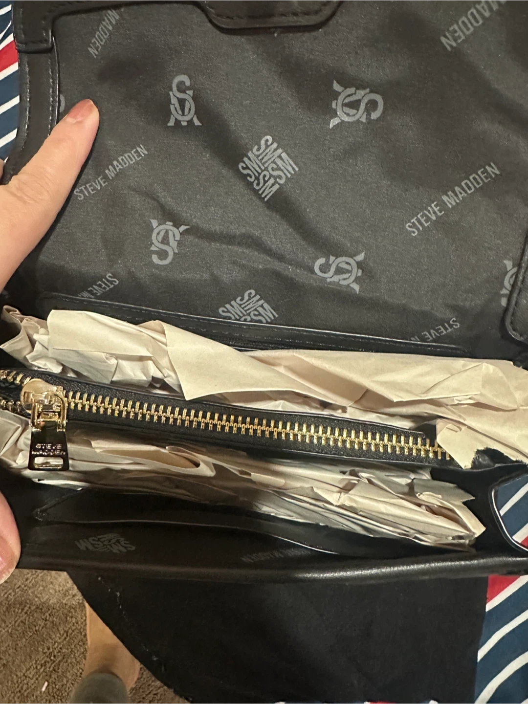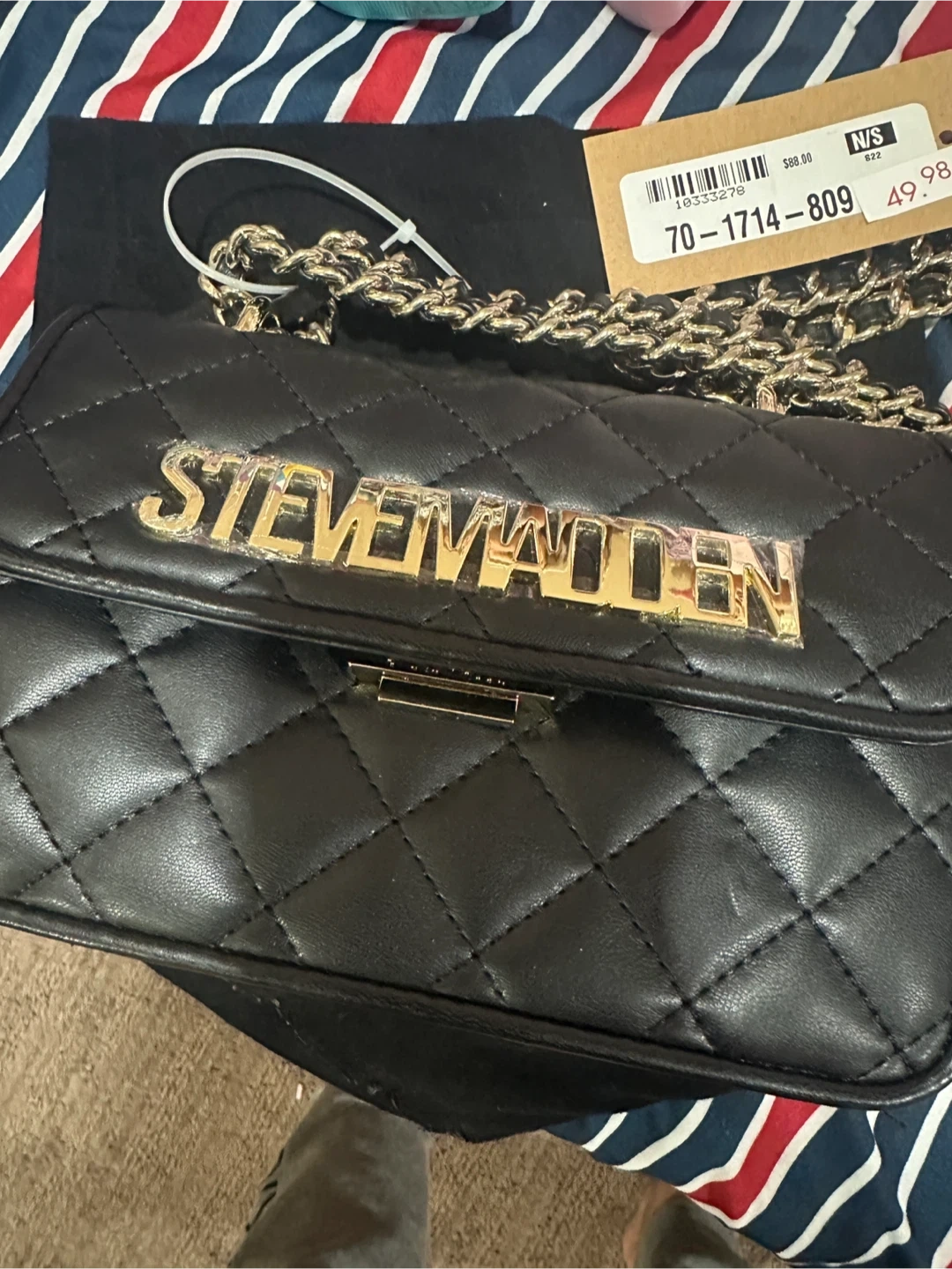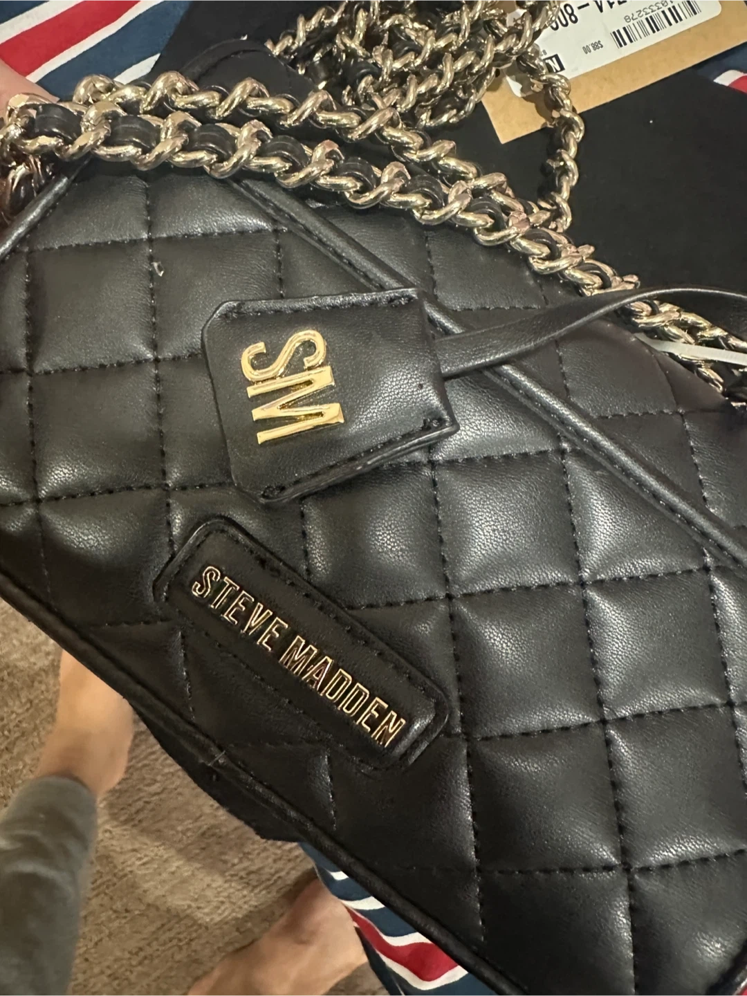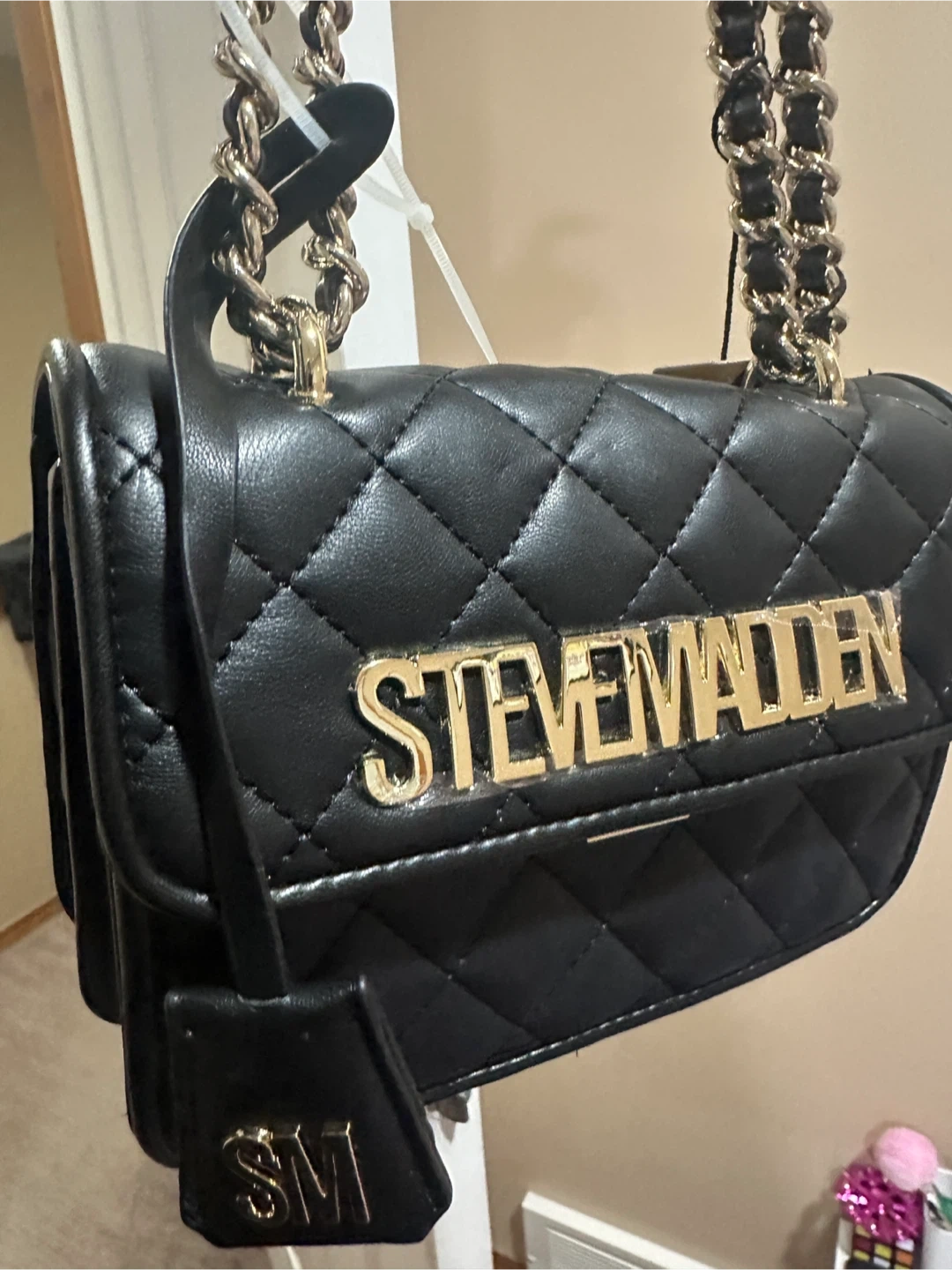 Selling a stylish Steve Madden black quilted crossbody bag! It features a chic chain strap and the brand name prominently displayed. The bag includes a dust bag for storage.