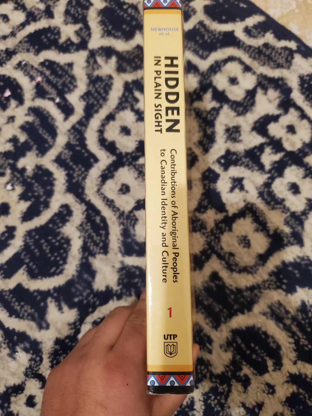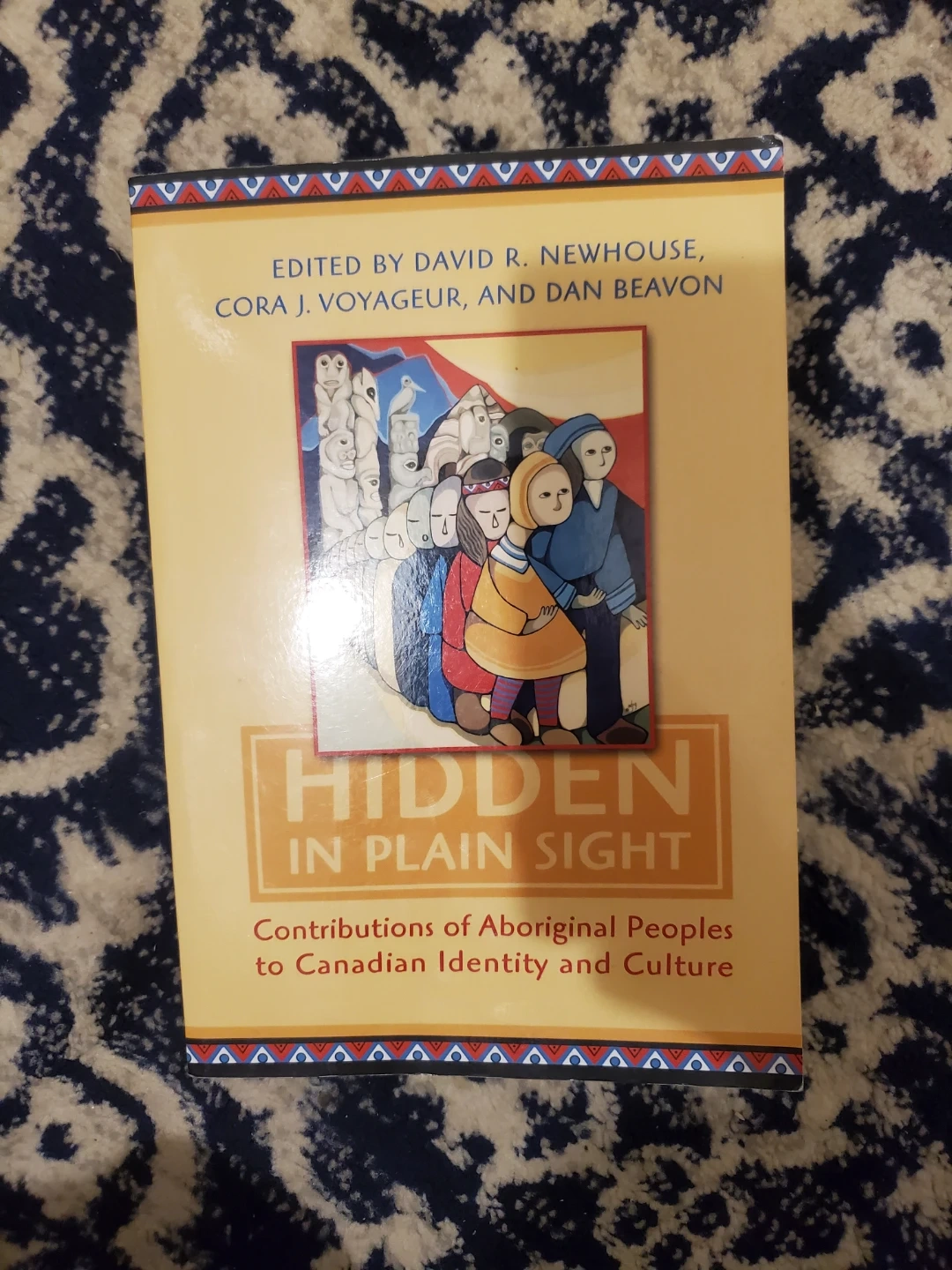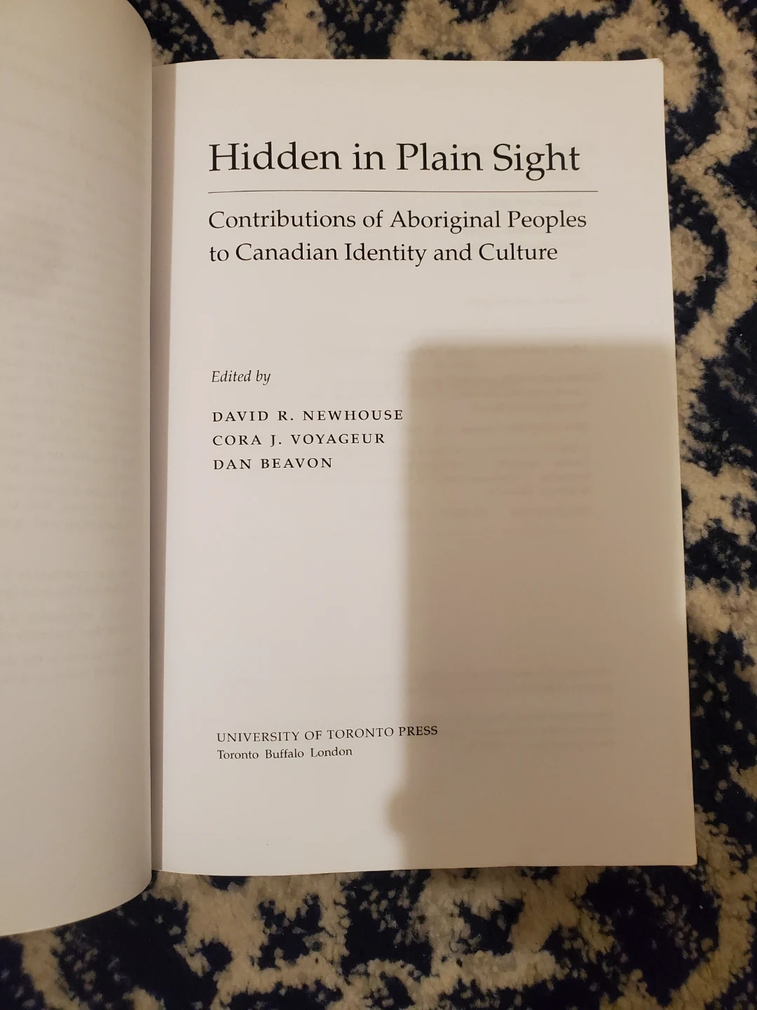 Selling a copy of Hidden in Plain Sight: Contributions of Aboriginal Peoples to Canadian Identity and Culture. Edited by David R. Newhouse, Cora J. Voyageur, and Dan Beavon. Published by the University of Toronto Press.