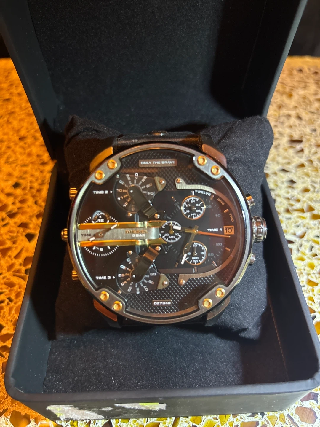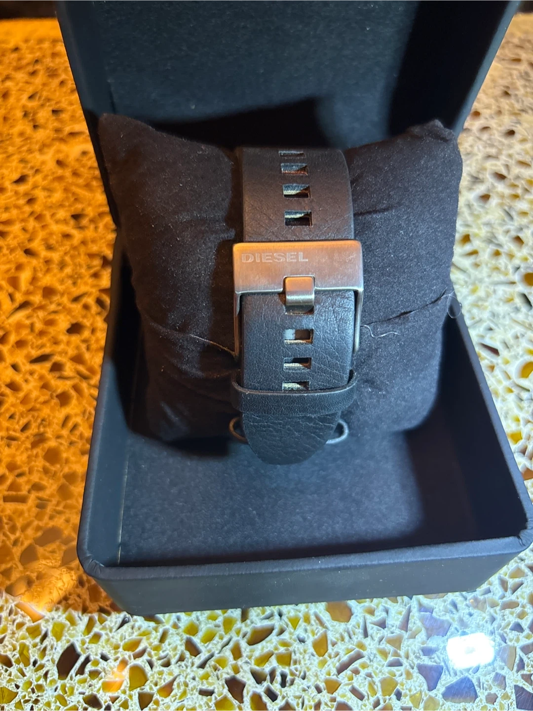 Diesel Mr. Daddy 2.0 watch in new condition! It comes with the box. The watch has a black leather strap and a unique, detailed face. If you're looking for a statement piece, this is it!