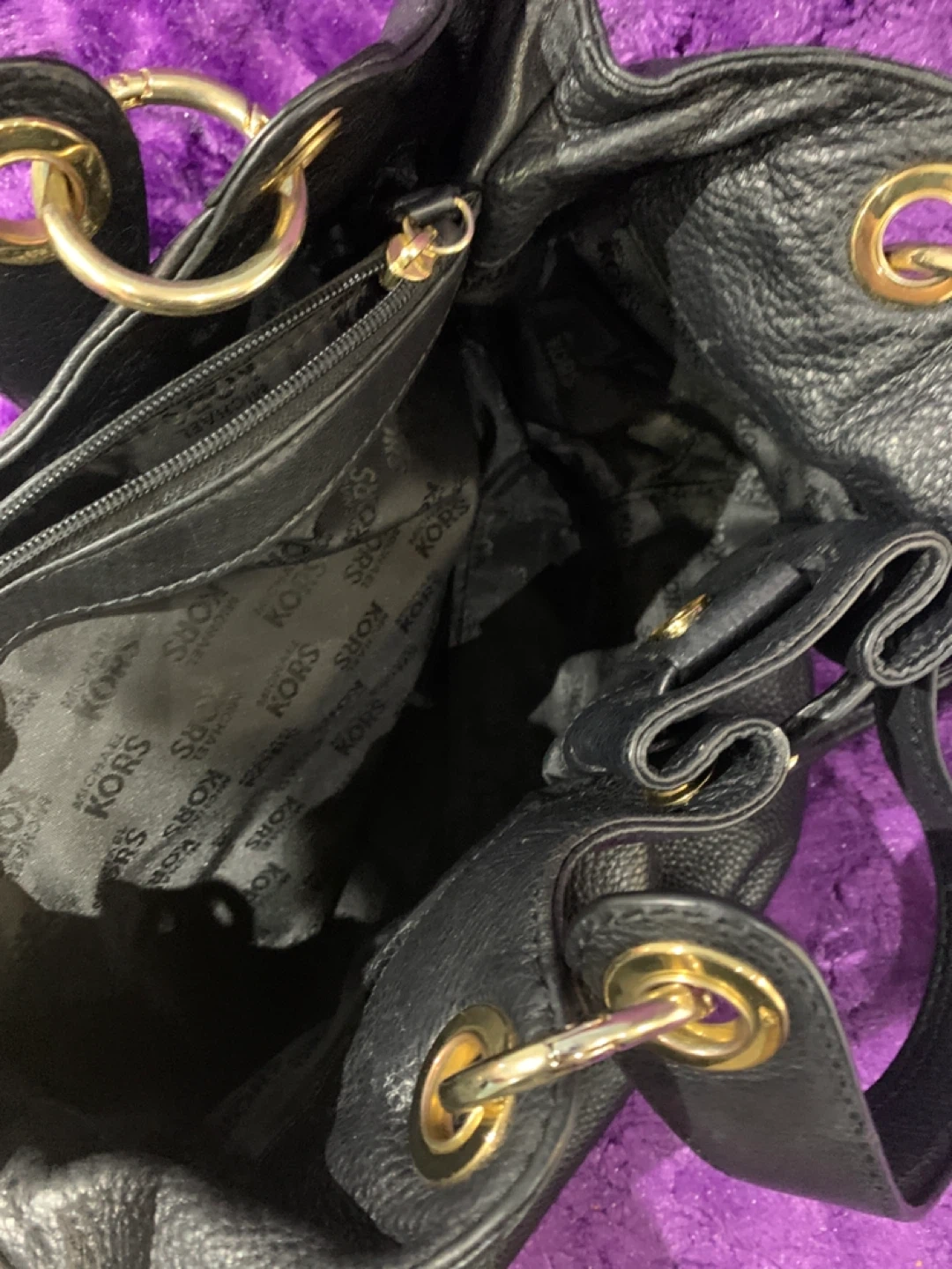 Here's a stylish black leather handbag from Michael Kors! It's in great condition and ready for a new owner. The bag features gold-tone hardware and a drawstring closure. Perfect for everyday use!