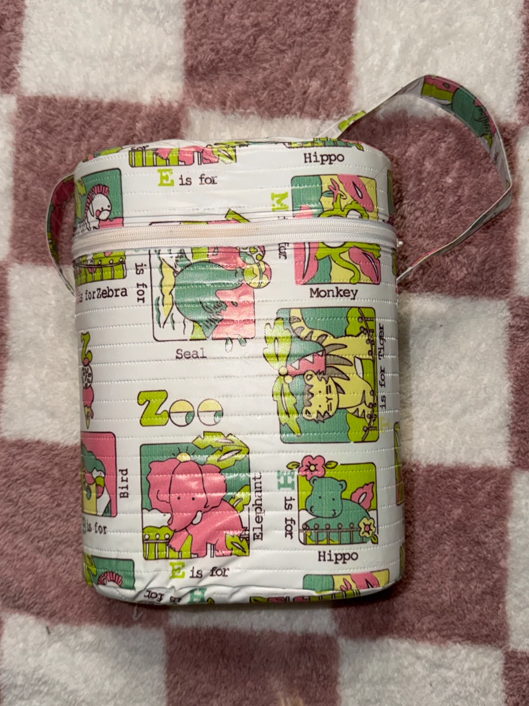 Zoo themed insulated double bottle carrier. It has a zipper closure and a carrying strap. Perfect for keeping your baby's bottles cold or warm while on the go!