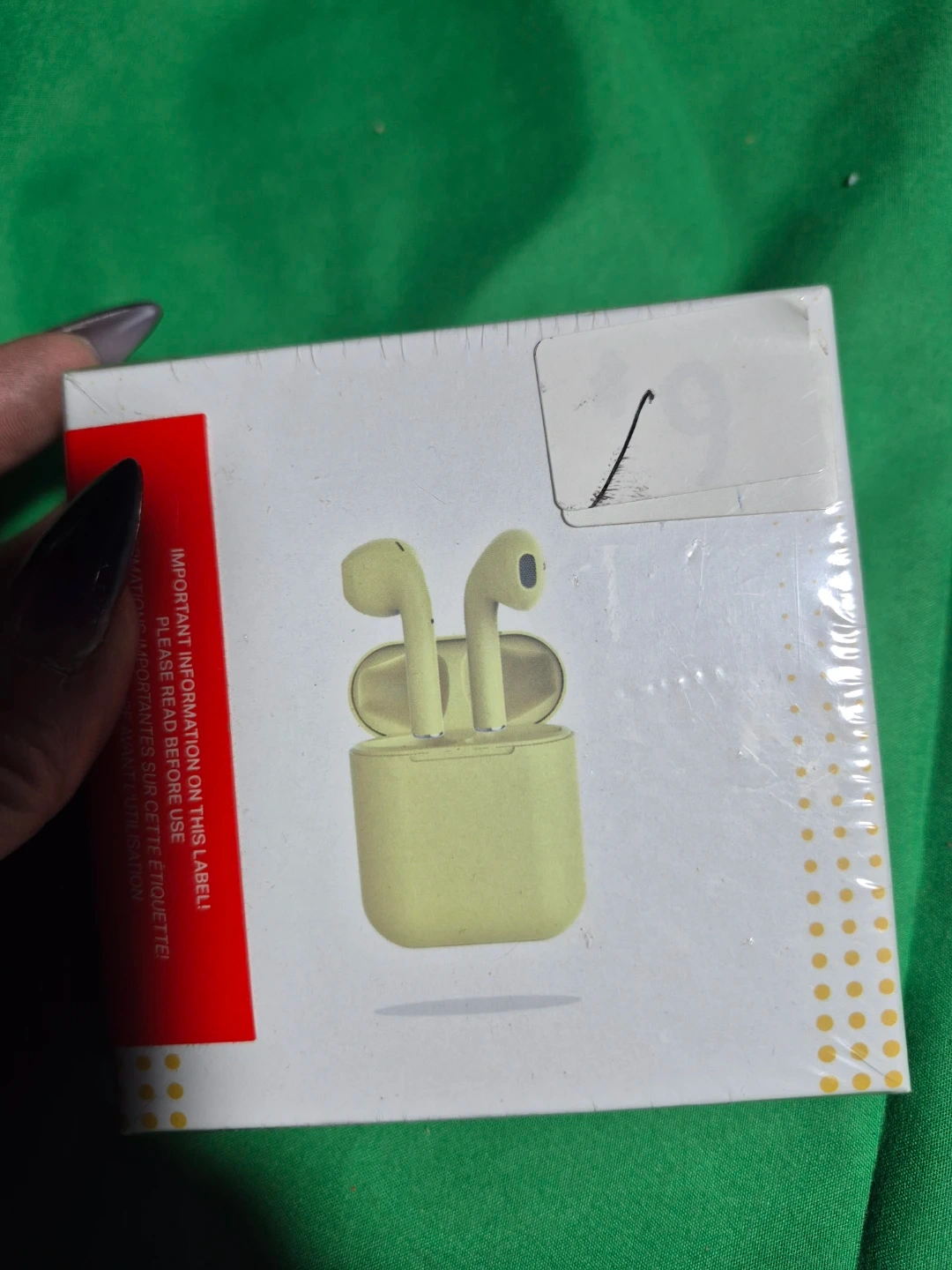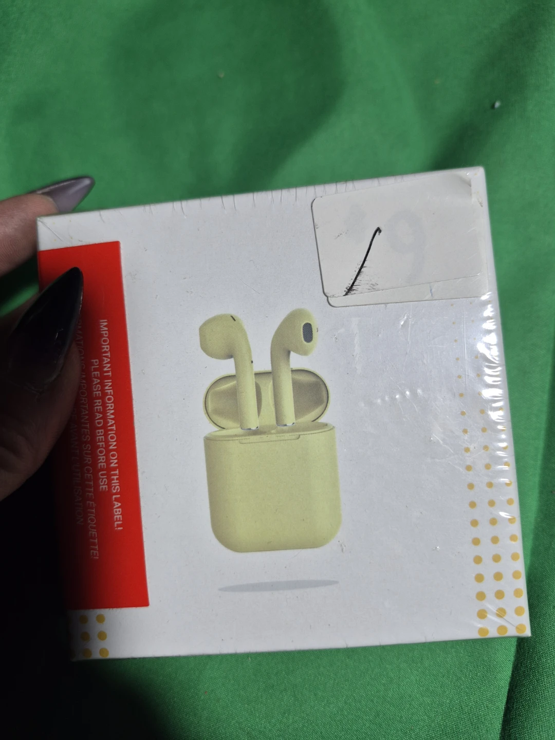 Selling a brand new pair of AirBuds 4X12 in yellow! They're still sealed in the original packaging, so you'll be the first to enjoy them. Great for listening to music or podcasts on the go!