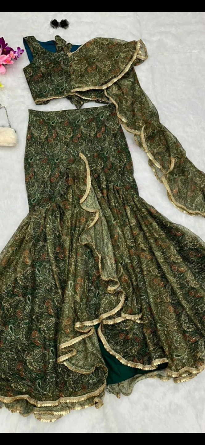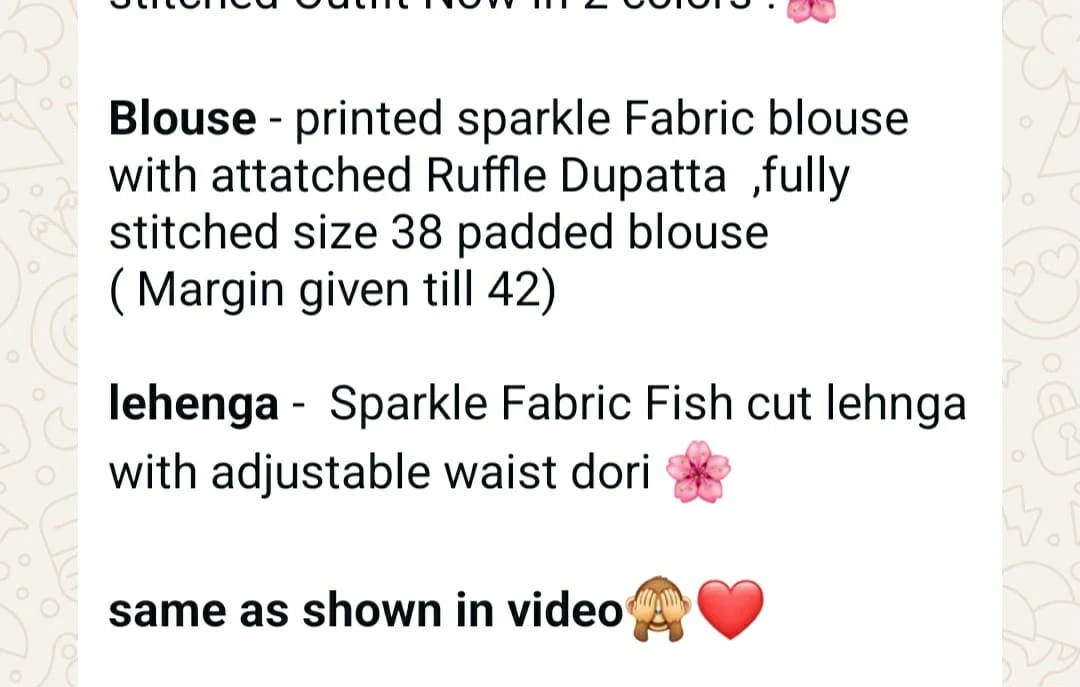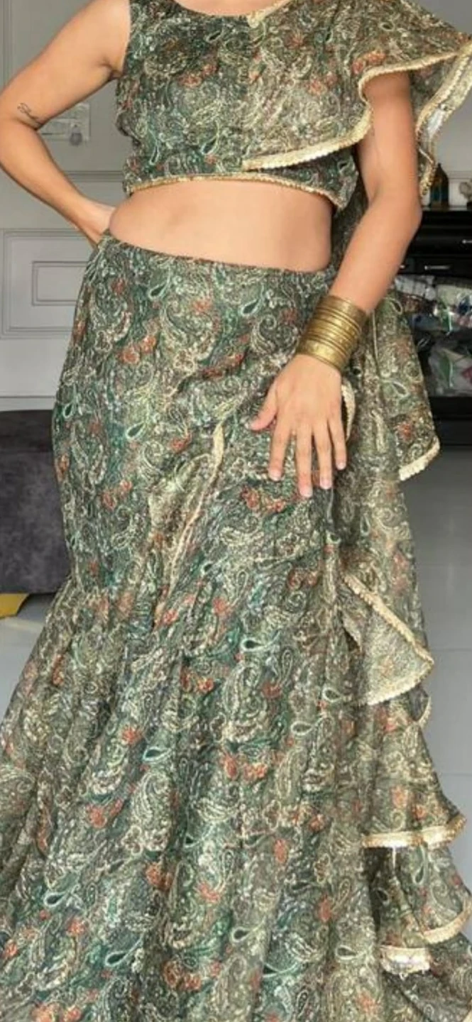 Selling a beautiful lehenga and blouse set made from sparkle fabric! The blouse is a size 38, fully stitched and padded, with a ruffle dupatta. It can be adjusted up to size 42. The lehenga has a fish cut with an adjustable waist.