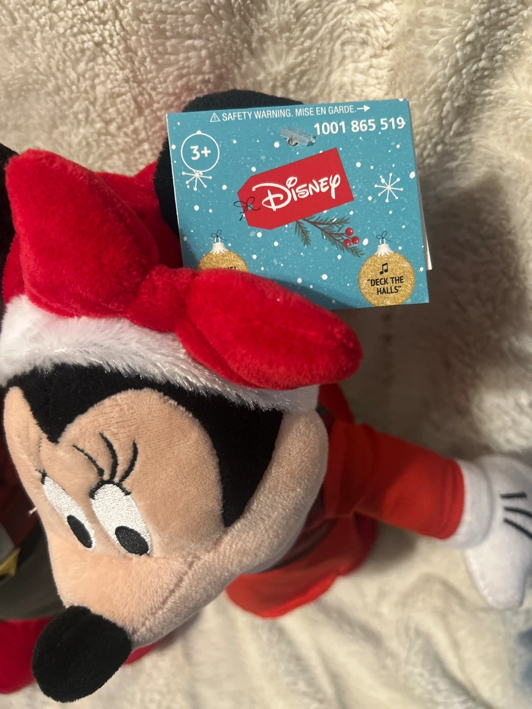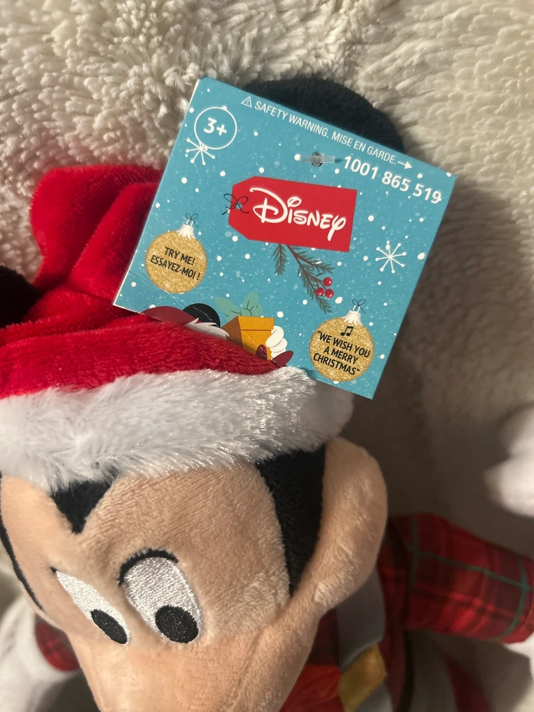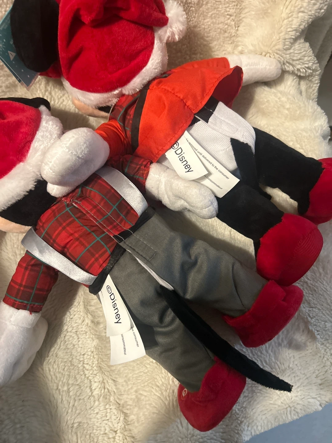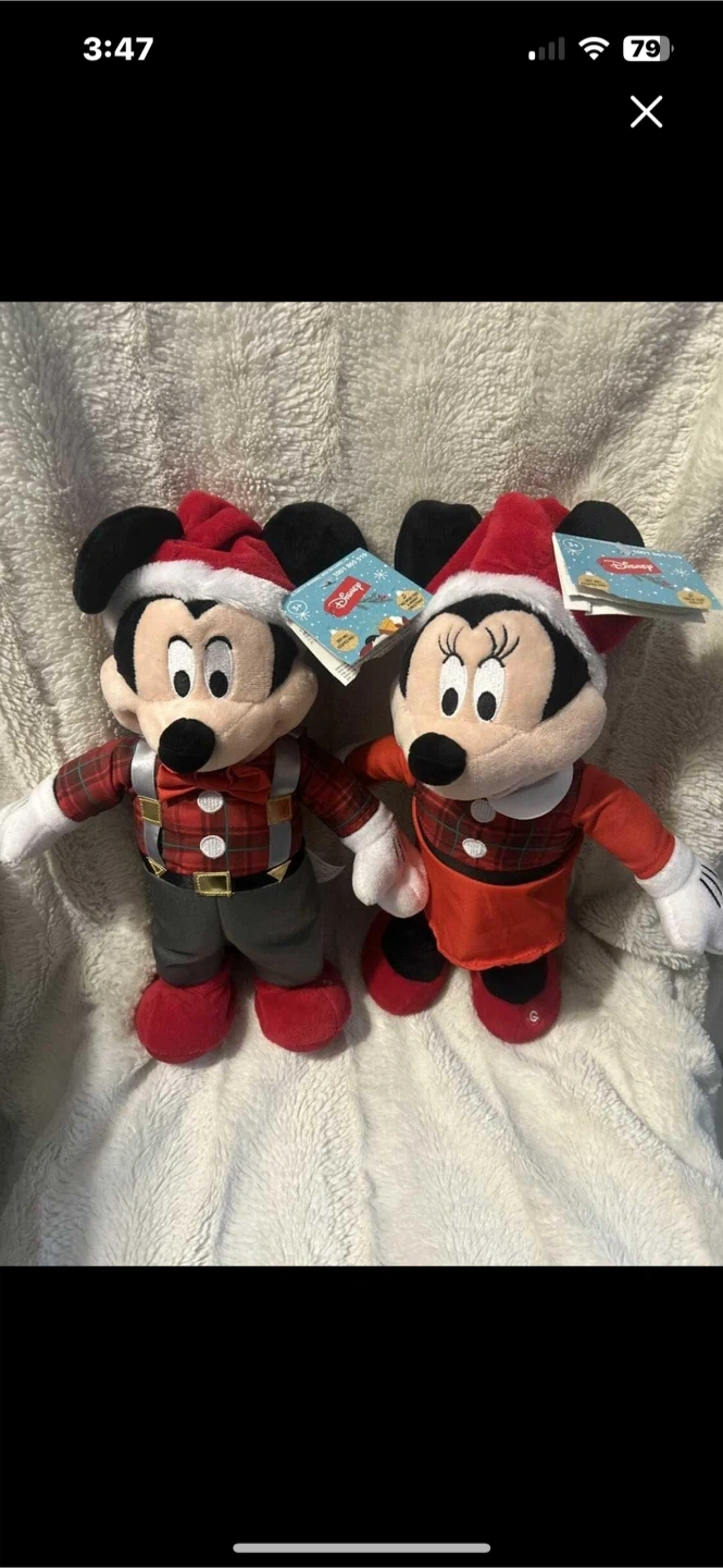 Selling a new set of Disney Mickey and Minnie Mouse holiday plush toys! They're both dressed in their holiday best and ready to spread some cheer. Recommended for ages 3+