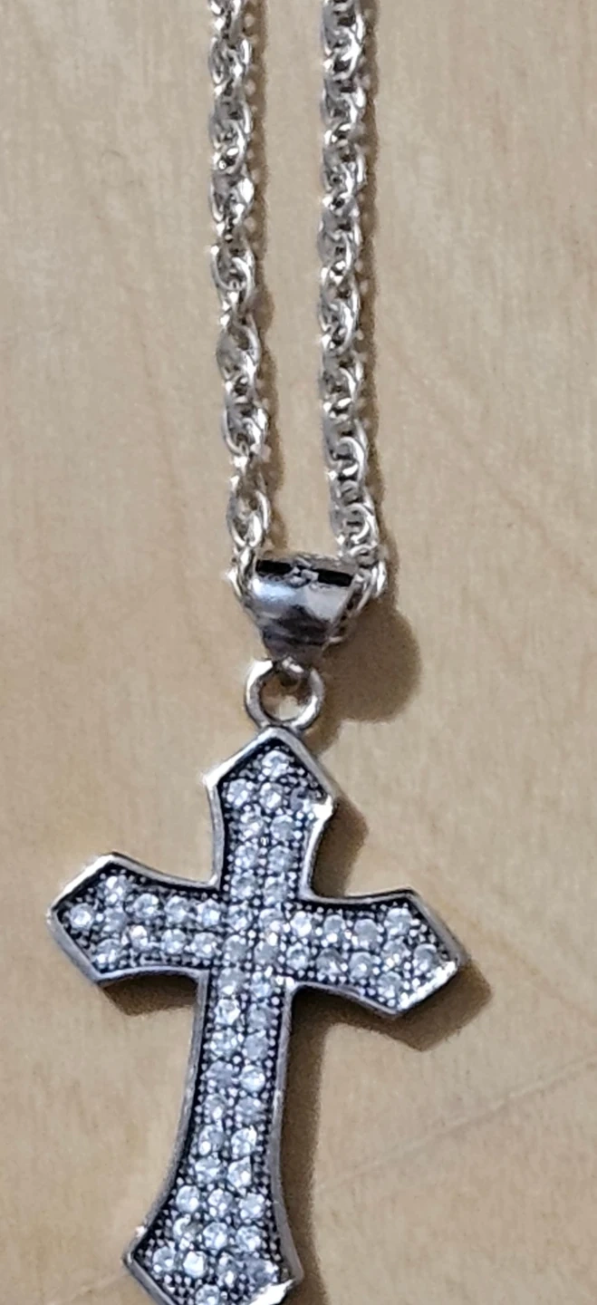chain and a cross pendant decorated with small stones.