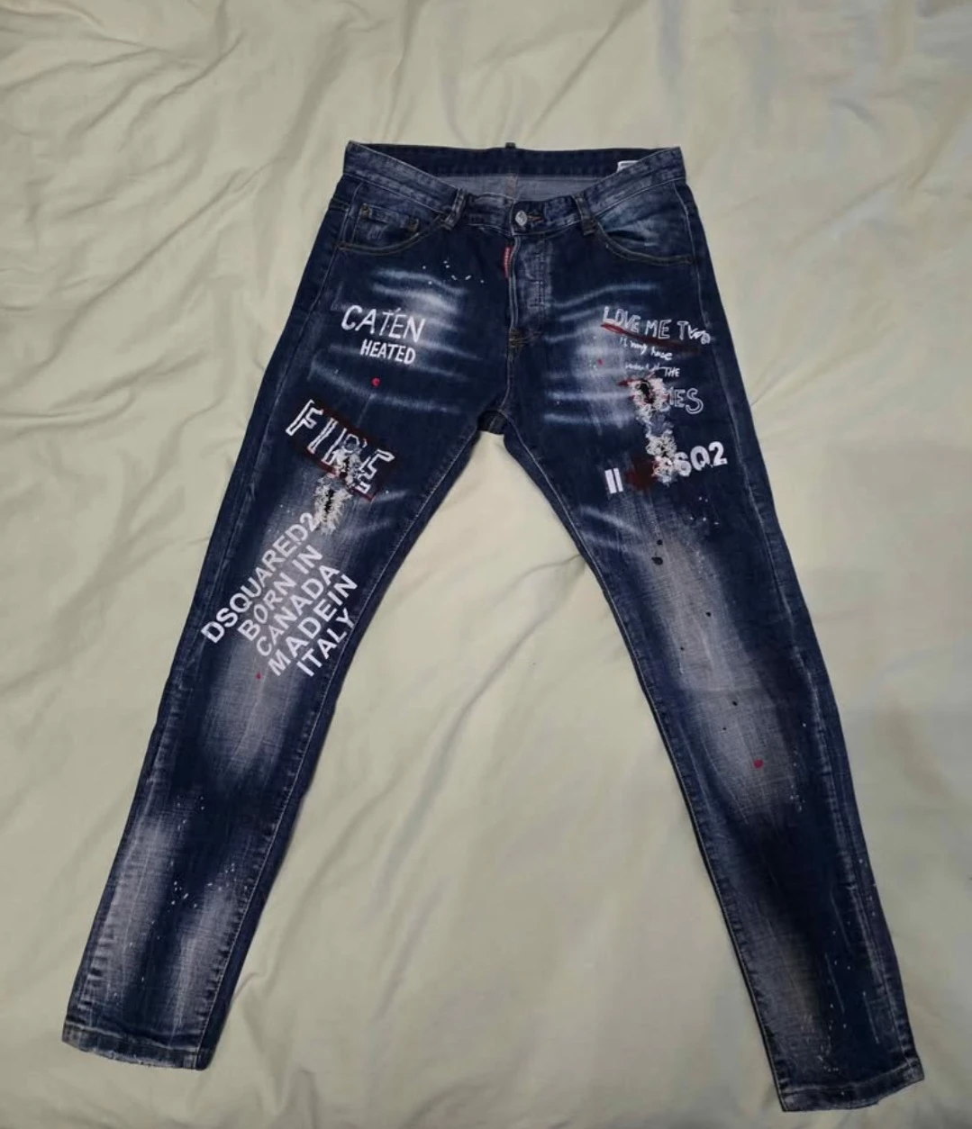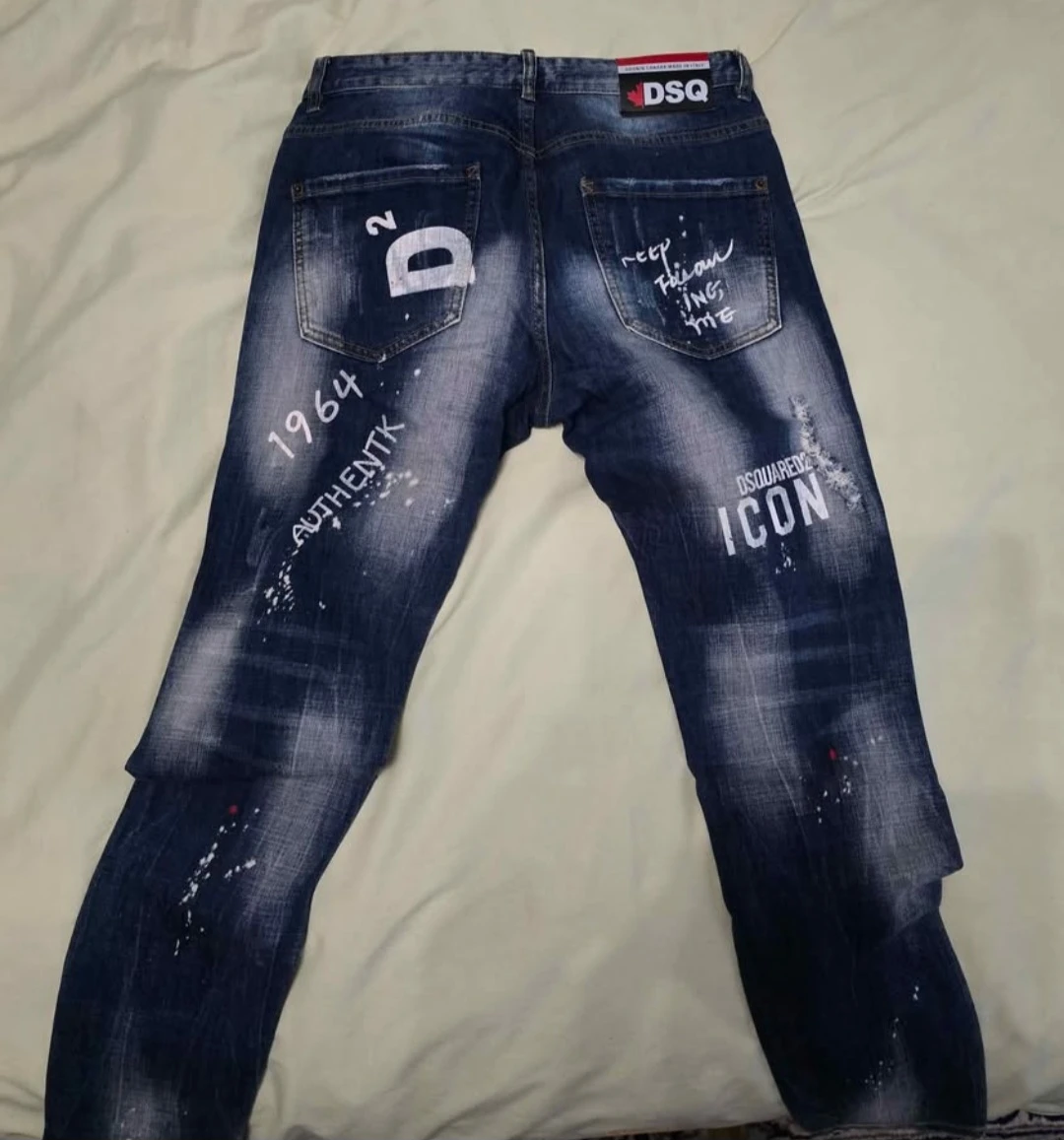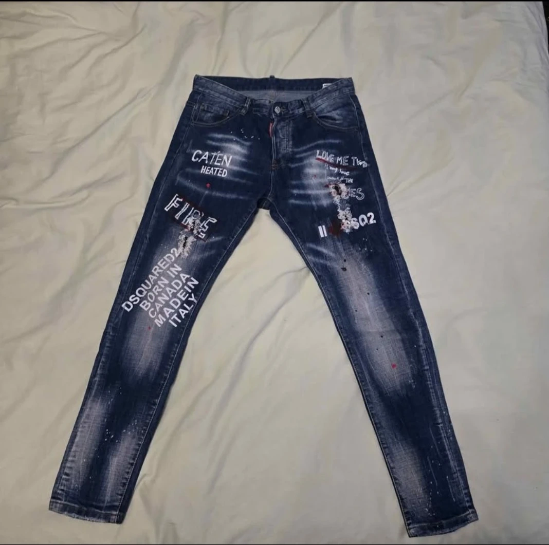 Selling a pair of Dsquared2 ICON jeans with a unique design. These jeans feature distinctive graphics and a stylish, worn look. Perfect for adding some edge to your wardrobe!