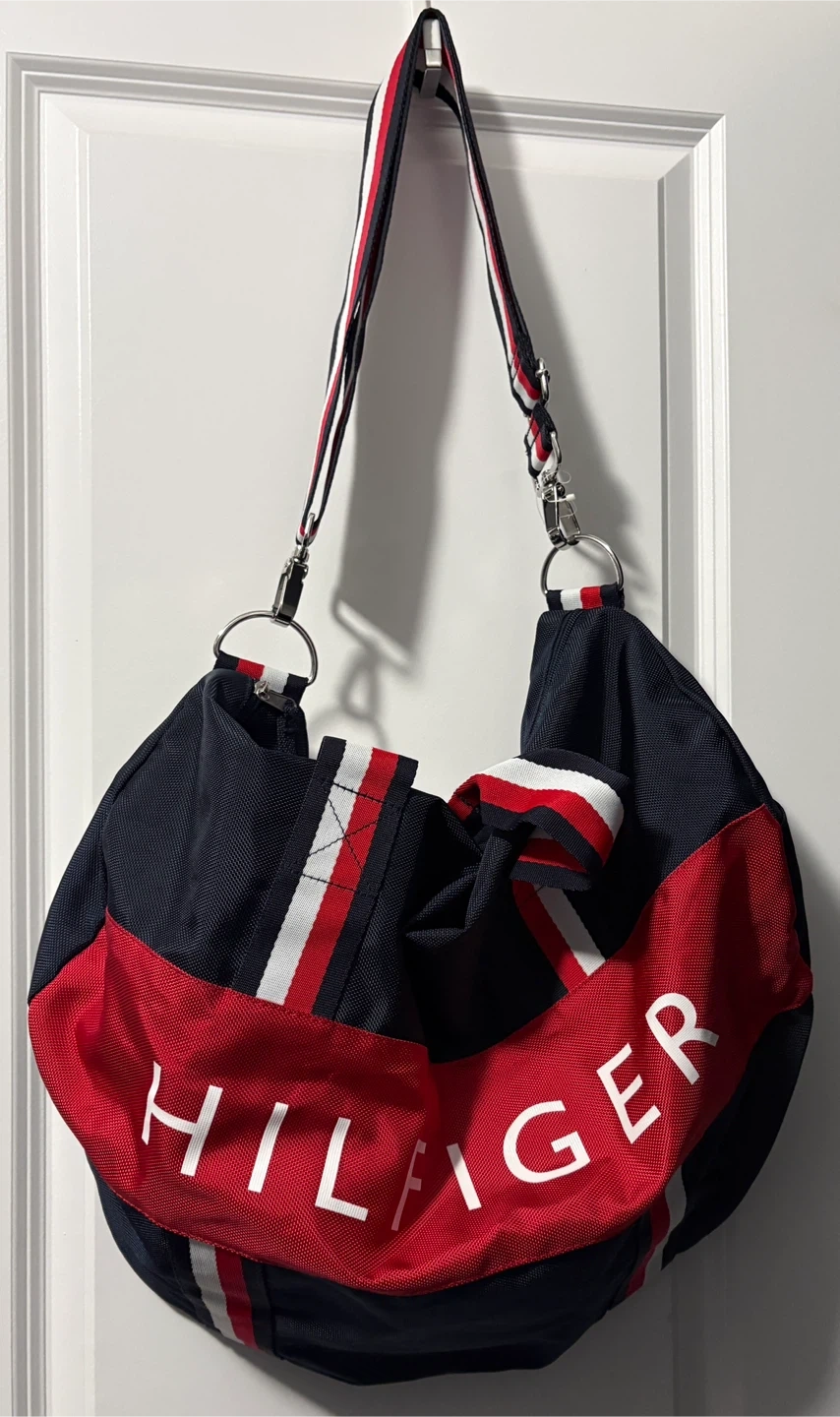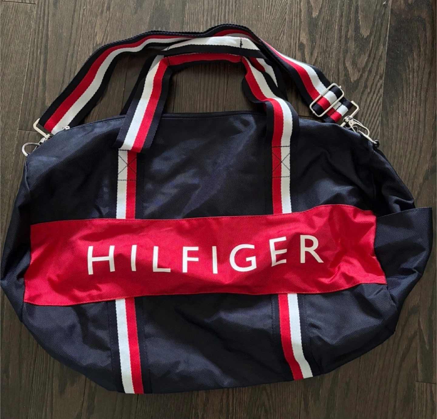 Navy blue Duffle bag. Red, white, and navy striped shoulder straps. Large main compartment. Smaller interior zippered pocket. Perfect for the gym and weekend getaway.