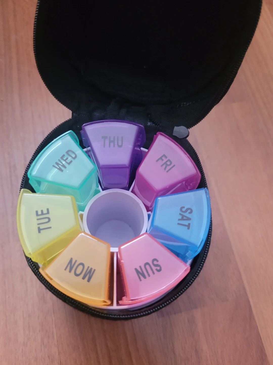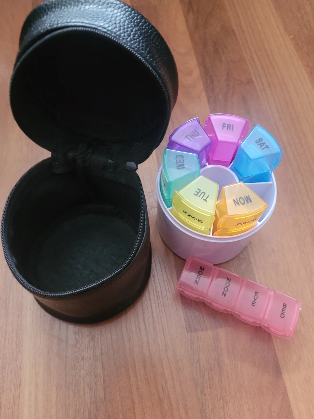 Organize your medication with this convenient pill organizer, featuring individual compartments for each day of the week and a carrying case for discreet transport. This item is new never been used in excellent condition, ready to help you keep track of your daily doses.