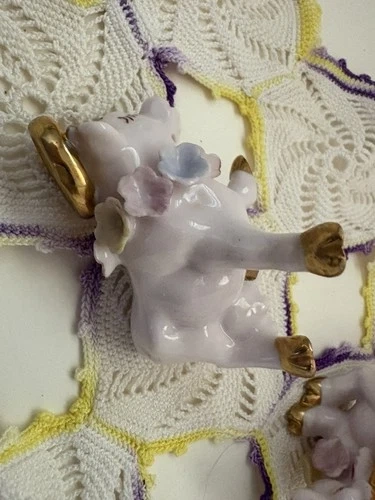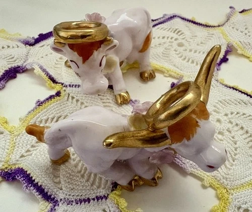 Add a touch of whimsy to your dining experience with these charming Napco Japan salt and pepper shakers, featuring an adorable and playful bull and cow motif in a soft pink and gold color palette, reflective of the themes of the 1950s. The shakers are both reusable easy to clean and a delightful addition to any table setting. Measuring at a quaint 2 inches in height and 2.5 inches in width, they are perfect for all occasions, be it a casual meal or a festive gathering. They are light weight,easy to handle and pour without tipping over. Both are in great condition. Some very minor paint wear. No chips or cracks. If you have any questions please don’t hesitate to ask. Thank you.