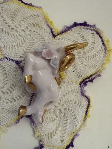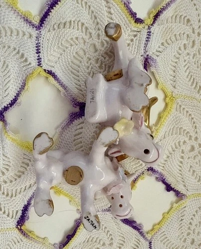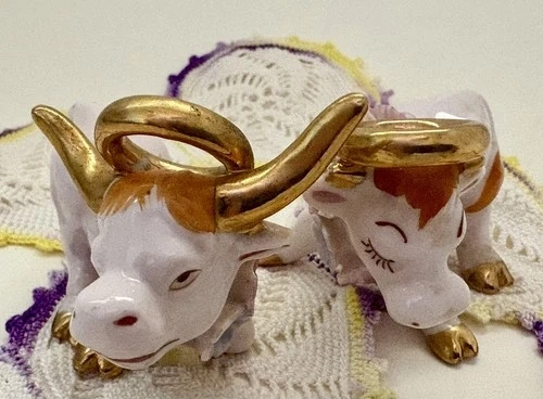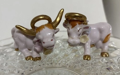 Add a touch of whimsy to your dining experience with these charming Napco Japan salt and pepper shakers, featuring an adorable and playful bull and cow motif in a soft pink and gold color palette, reflective of the themes of the 1950s. The shakers are both reusable easy to clean and a delightful addition to any table setting. Measuring at a quaint 2 inches in height and 2.5 inches in width, they are perfect for all occasions, be it a casual meal or a festive gathering. They are light weight,easy to handle and pour without tipping over. Both are in great condition. Some very minor paint wear. No chips or cracks. If you have any questions please don’t hesitate to ask. Thank you.