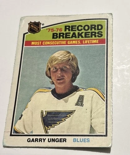 RECORD BREAKERS - MOST CONSECUTIVE GAMES. LIFETIME. Garry Unger of the St. Louis Blues. Card #68 captures Unger during his record-breaking 1975-76 season, celebrated in the '75-76 Record Breakers' set, a must-have for enthusiasts and collectors alike.
