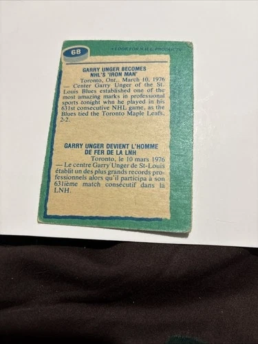 RECORD BREAKERS - MOST CONSECUTIVE GAMES. LIFETIME. Garry Unger of the St. Louis Blues. Card #68 captures Unger during his record-breaking 1975-76 season, celebrated in the '75-76 Record Breakers' set, a must-have for enthusiasts and collectors alike.