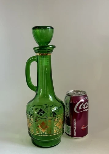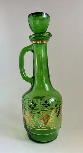 Lovely green glass carafe from around the 1960s. It is in good condition. Gold decoration is great. No chips no cracks.