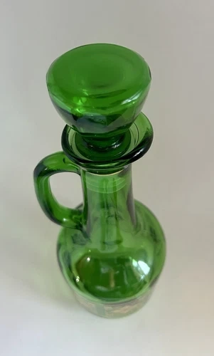 Vintage MCM Barware Green & Gold Glass Decanter w/ Stopper