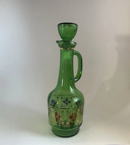 Vintage MCM Barware Green & Gold Glass Decanter w/ Stopper