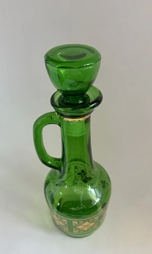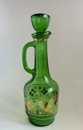 Lovely green glass carafe from around the 1960s. It is in good condition. Gold decoration is great. No chips no cracks.